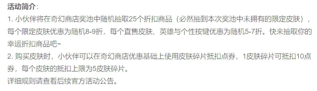 看介绍,玩家可以随机选择25个商品,包括限定和非限定皮肤、英雄、个性按键等等。其中限定皮肤是8-9折,其他是5-7折。然后可以用皮肤碎片来抵扣点券,1个碎片抵扣10点券,上限是5个皮肤碎片,也就是至多可以在随机8-9折的基础上再少50点券。本次必出的三款皮肤是李白谪仙醉月、曜山海苍雷引、芈月浮光幕影。也算是又一个返场渠道吧。