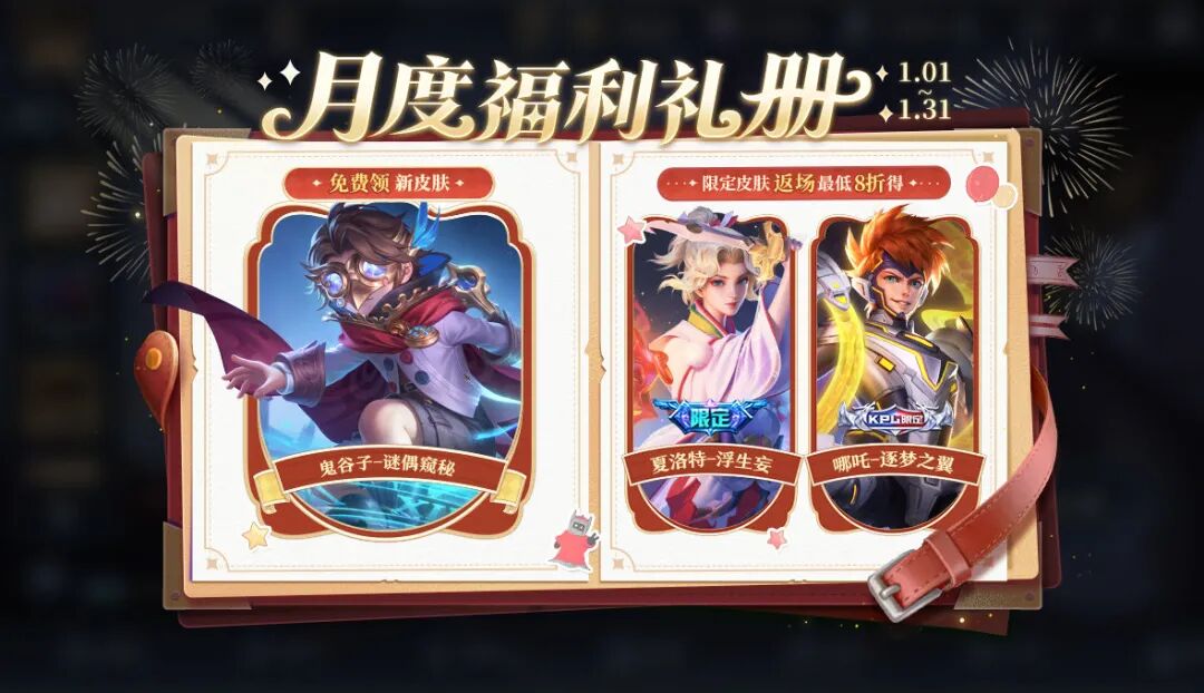月度礼册更新,加入了之前提到过的鬼谷子的新皮肤谜偶窥秘,然后返场了两款皮肤,分别是夏洛特浮生妄和哪吒逐梦之翼。