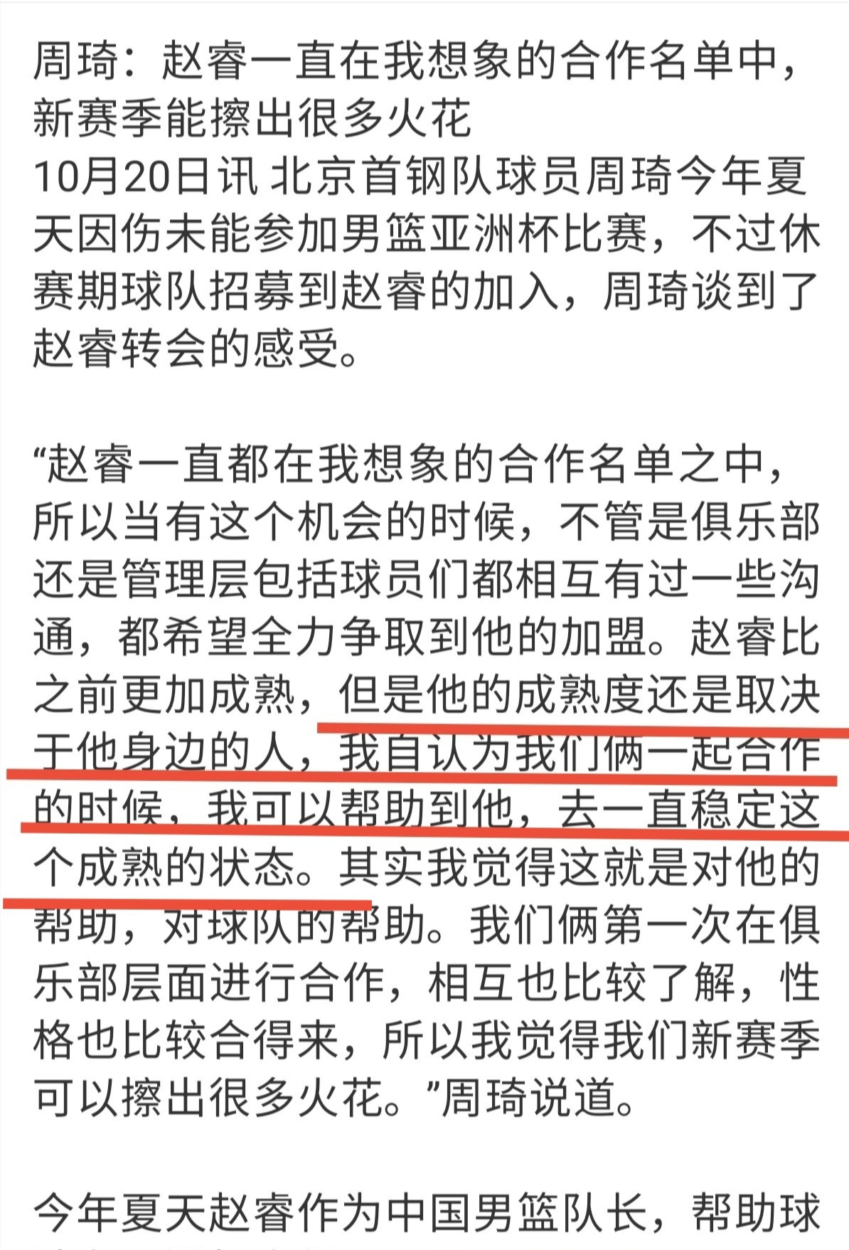 我们主要还是谈谈新赛季,周琦能跟赵睿到底能擦出哪些很多火花?