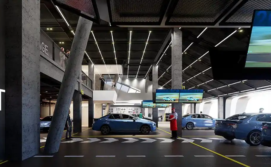内部空间的设计逻辑与外部保持连贯。在材料选择上,中性金属、超白玻璃、彩釉玻璃等未来感材质被延续使用,并依托灯光设计来营造统一、科技、简约的空间氛围,同时兼顾了材料的耐用性与表现力。在功能组织上,领克成都MEC总建筑面积约为3884平方米,建筑高度24米,内部划分为四层空间。各楼层的功能配置均充分考虑了领克品牌的定位以及用户的多样化体验需求。它创新性地突破了传统赛道建筑的局限,在雕塑化的外立面内部,采用垂直叠合的功能模块布局,整合了沉浸式品牌展厅、活动沙龙、观景露台、赛车模拟器、社区休息区及服务大厅等多元场景。这种模块化设计赋予了空间高度的适应性,能够灵活服务于品牌展示、赛事支持、社交体验、家庭休闲等多种用途,同时,集约化的空间利用方式也有效降低了运营碳足迹,体现了项目在经济性和环境可持续性方面的考量。