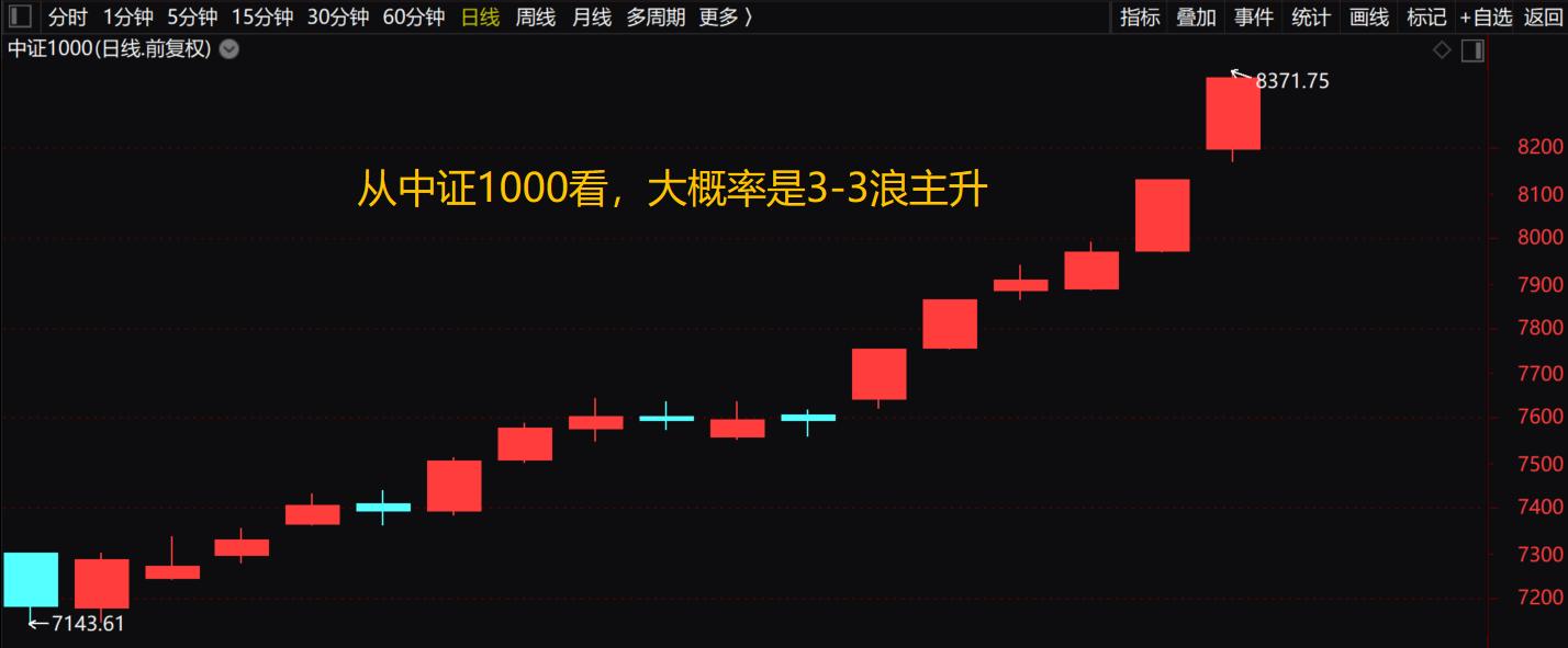 02 明天的行情会怎么走?对明天走势的预判。我觉得眼下有几点需要心里有数:其一是当前大盘的整体趋势还在延续,指数依旧沿着5日均线往上走,今天的日K线并没有大幅偏离均线,这说明从技术上看短期并没有出现明显的乖离信号。从中证1000、中证2000、国证2000之类的指数来看,主升浪趋势明显,只要明天大盘不开得太高,估计指数还能再创新高。