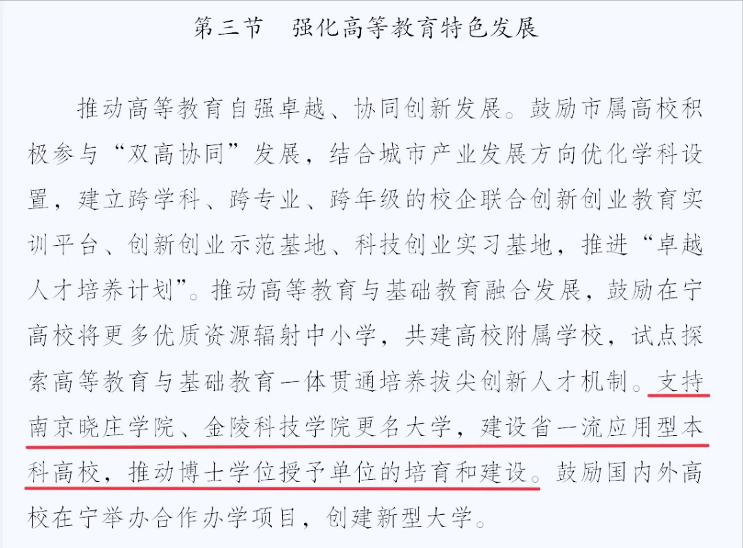不过,需要提醒一下,政府规划里写的是支持,并非批准,更名大学得经过教育部审批,光有地方政府的想法并不行,硕士点的数量、在校研究生的规模、科研成果、师资结构, 每一项都有实实在在的标准,金陵科技学院离成功更近点,但也不是明天就能实现,晓庄学院要走的路明显更长,3、5年内能完成就算快的。
