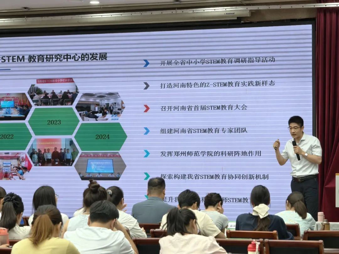8月10日下午,河南省STEM教育研究中心专家团成员、河南省科学教育名师、河南省教师教育专家、河南省教育技术装备与实践教育专家刘明,首先作了《基于Z-STEM教育理念的工程实践课程设计与实施研究》的主题讲座。他向学员们介绍了STEM教育、造创教育的内涵和案例,以及河南省STEM教育研究中心的发展历程、重点举措和Z-STEM中原探索。