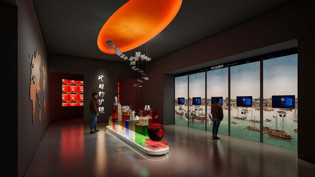 项目落地泉州市丰泽区,采用“感知·城市客厅—认知·文化博览—体验·风味实践”的布局闭环,以竖向分层设计与叙事化动线,串联四大核心展区与结语空间,实现参观节奏与文化表达的有机统一。整体设计风格融合闽南红砖古厝、南洋花砖等地域元素,以“古厝红、海丝蓝、烟火橙”为基调,兼顾传统底蕴与现代感。