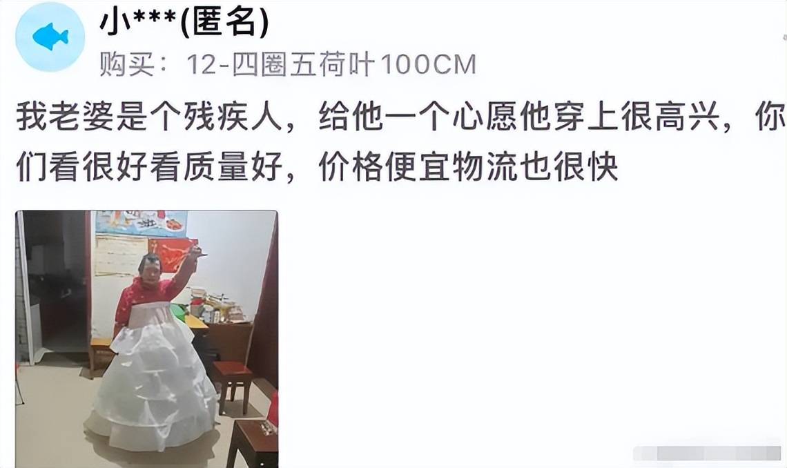 还有 38 元廉价婚纱的买家秀。2022 年,这条婚纱冲上热搜,有评论说 “我老婆是残疾人,给她穿上她很高兴,圆了她的婚纱梦”,获数十万点赞祝福,没人嘲笑。照片里妻子瘦弱,桌子堆满药,这样的生活,换做别人未必有这份豁达乐观。商家看到评论后,立刻给顾客退了两倍原价,这就是现实版的温暖。