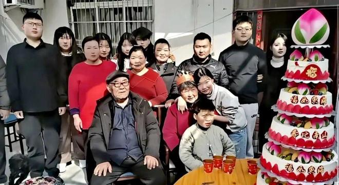 六层寿桃蛋糕,上面写着“福如东海、寿比南山”,顶上还有个大寿桃。搁普通农村寿宴,两层都算体面,六层确实够隆重。