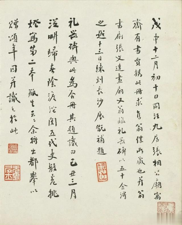 谭延闿行书题跋: 戊申(西元一九0八年)十二月初十日同汪九居。张相公庙寓斋有书贾携此册求售。翁仆所藏也。并翁书扇。张文达画扇。又翁临礼器碑。以五十金得之。越十三日归到长沙。展翫补题。谭延闿行书题跋: 礼器碑与此为合册。其题识曰。己丑三月从畊归。春隂澹沱。阅五代史数卷。挑灯写第二本。瓶生云云。余将出都举以赠颂年。因并识之于此。