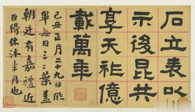 刘善渥楷书题跋: 民国元年(西元一九一一年)七月十日刘善渥过瓶斋观。 杨钧行书题跋: 常熟隶书专学道州。然横平竖直。则不如何。笔用铺毫。又得北法。壬子(西元一九一二年)五月二十六日杨钧记。
