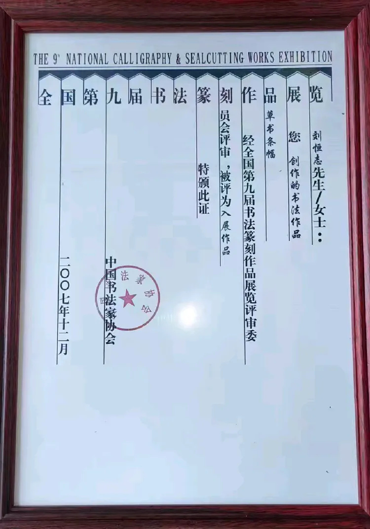 全国第九届书法篆刻作品入展并获奖。