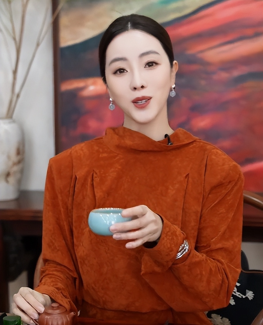 她换上了一件南瓜色绒面上衣,手腕上戴着银色的饰品,搭配了一对玉石耳坠,显得整个人很高级。