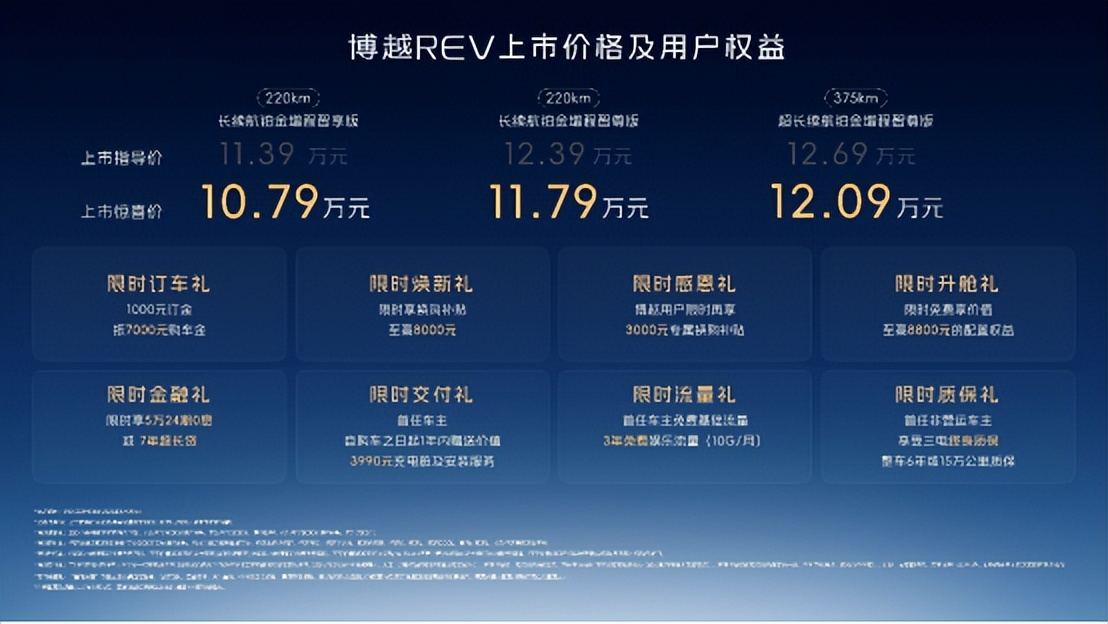 作为吉利博越十周年重磅力作,博越REV本次共推出三大版型:220km长续航铂金增程智享版、220km长续航铂金增程智尊版及375km超长续航铂金增程智尊版,上市惊喜价10.79万-12.09万元,起售价相比12.79万元的预售价格,整整下探了2万元,其中375km超长续航版本惊喜价12.09万元起,以同级领先纯电续航实力,树立A+级增程SUV价值新标杆。博越REV凭借吉利大厂品质和越级产品力,以极具诚意的售价,让20万级的高端增程体验走进更多家庭。