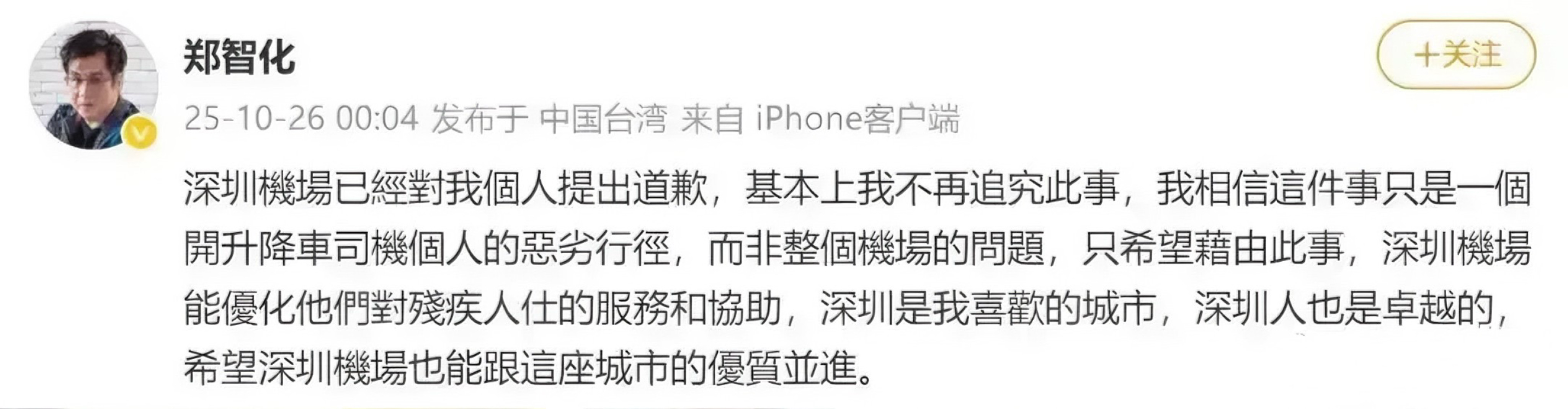 不久以后,深圳机场便发文,对郑智化的不佳体验致歉,并且表示对于该问题会第一时间启动核查,优化特殊旅客的服务保障细节。