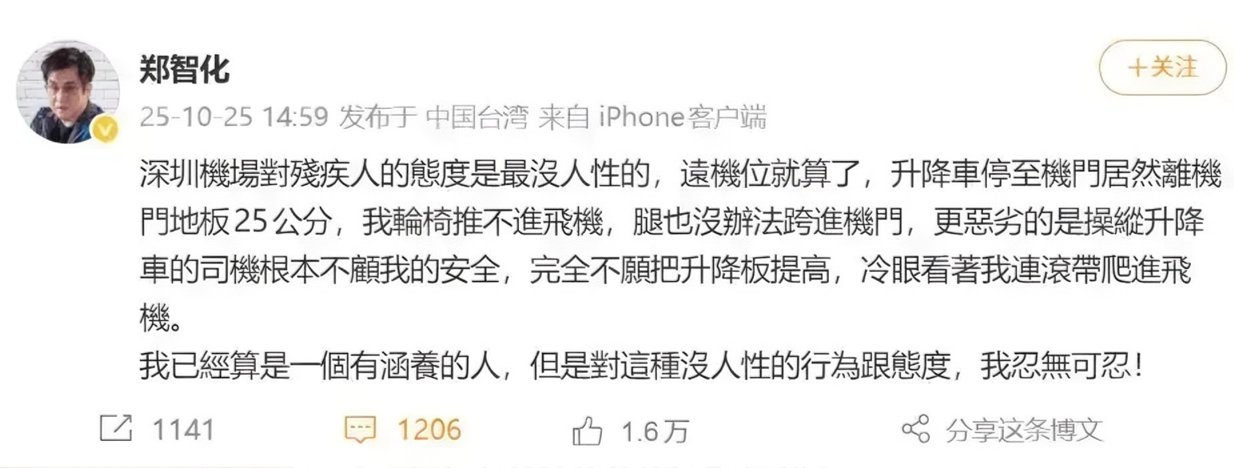 近日,歌手郑智化在深圳机场搭乘航班时遭遇不便。由于飞机舱门门槛高度远超登机梯车,其轮椅无法直接通行,最终由机场工作人员协助搀扶进入机舱。事后,郑智化通过社交平台表达不满,称自己‘近乎连滚带爬’地完成登机,引发公众热议。