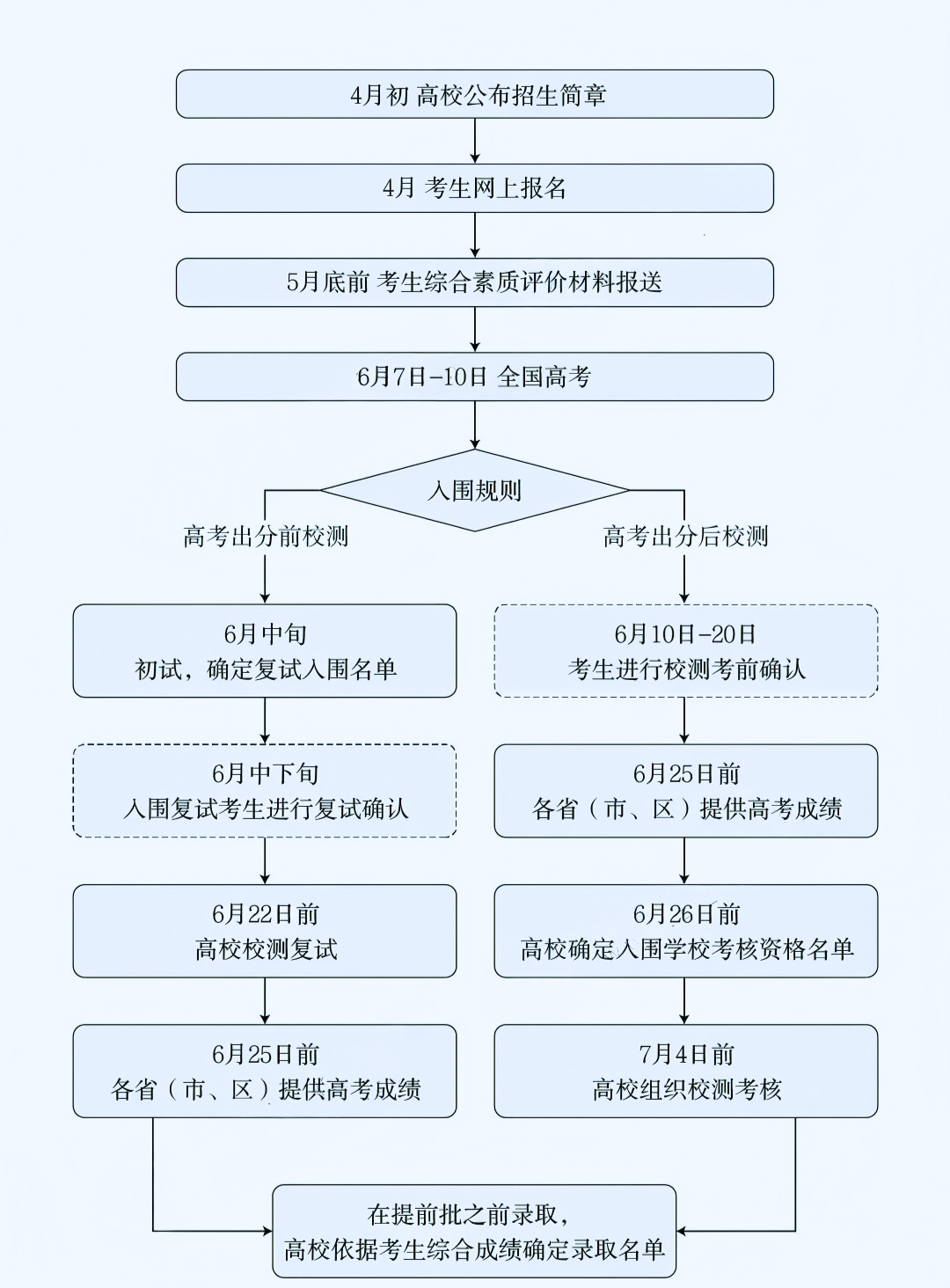 “复交南”模式,即校测提前至高考后出分前,报名成功就有资格参加校测初试,不以高考成绩确定入围名单,而是以校测初试成绩确定复试入围名单,再根据考生综合成绩择优录取。其中上交、复旦、中科大等12所高校采用此种校测模式。