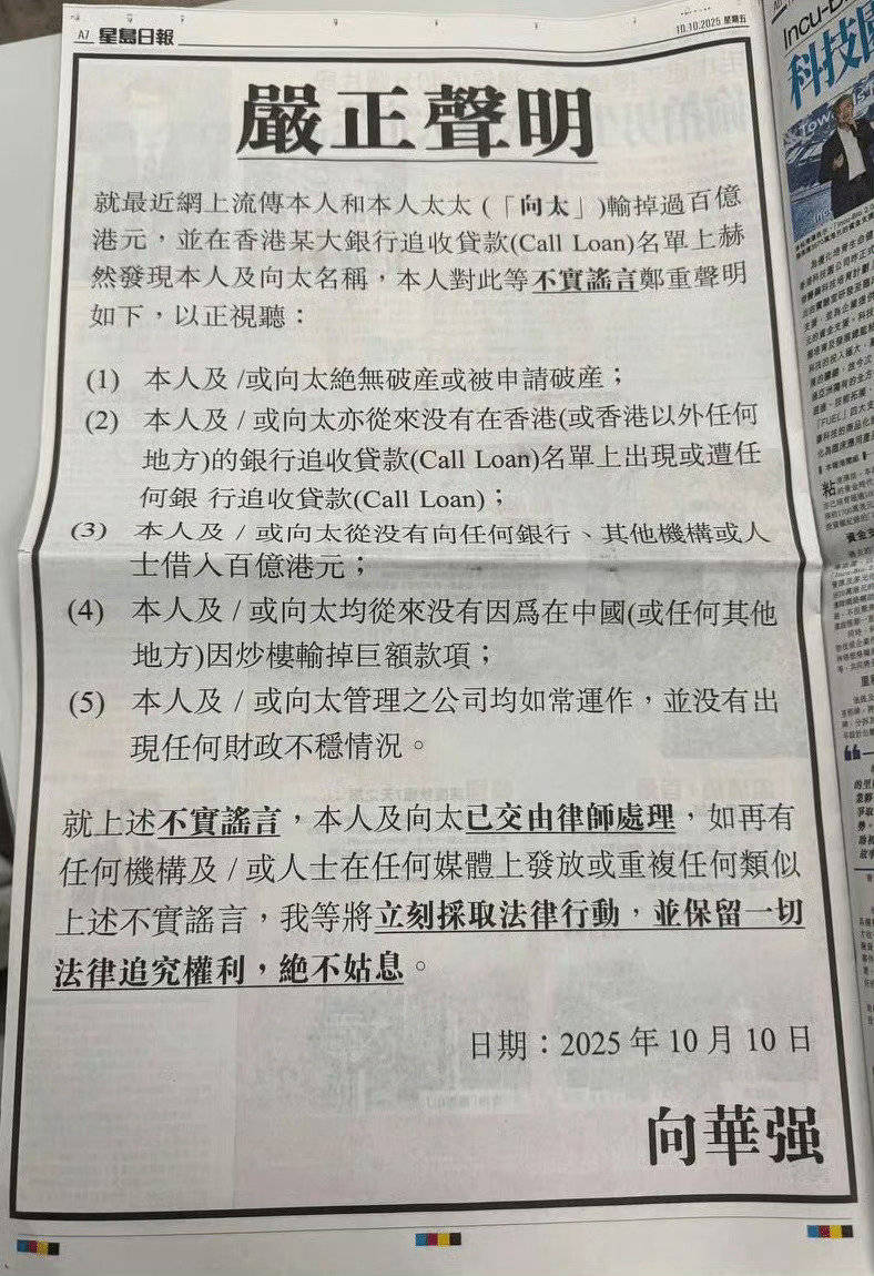 向华强夫妇可不干了,这谣言也太离谱了吧!向太陈岚怒了,向华强也坐不住了,两人决定一起出面,来个“王炸”辟谣。这可是向太亲自在记者会上说的,他们“绝无破产或被申请破产”,也“从未登上银行追收贷款名单”,更没有“因炒楼巨亏”,公司也运营如常。这还不算,向华强还发了个强硬声明,以五点精准驳斥谣言: