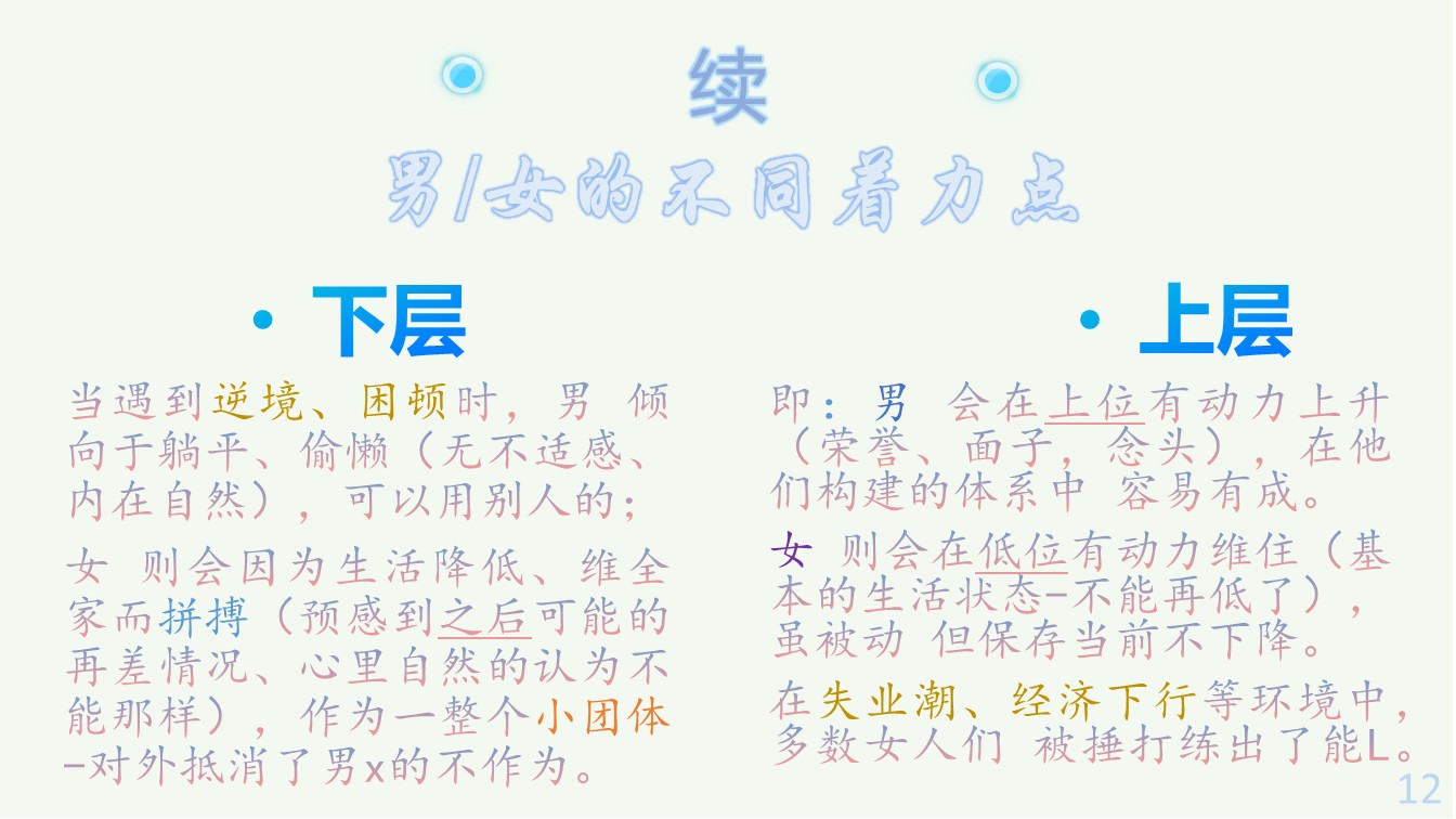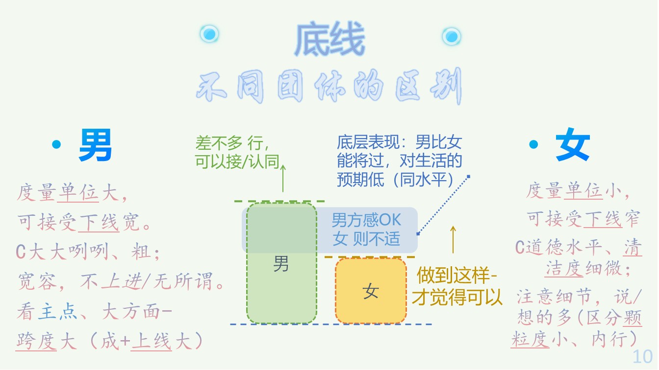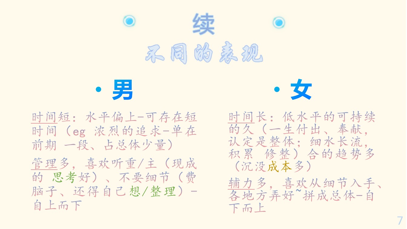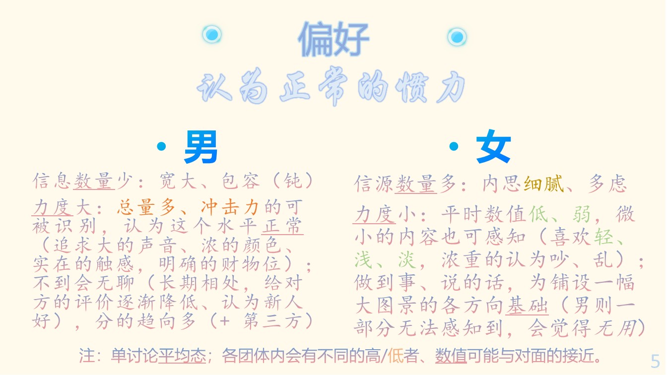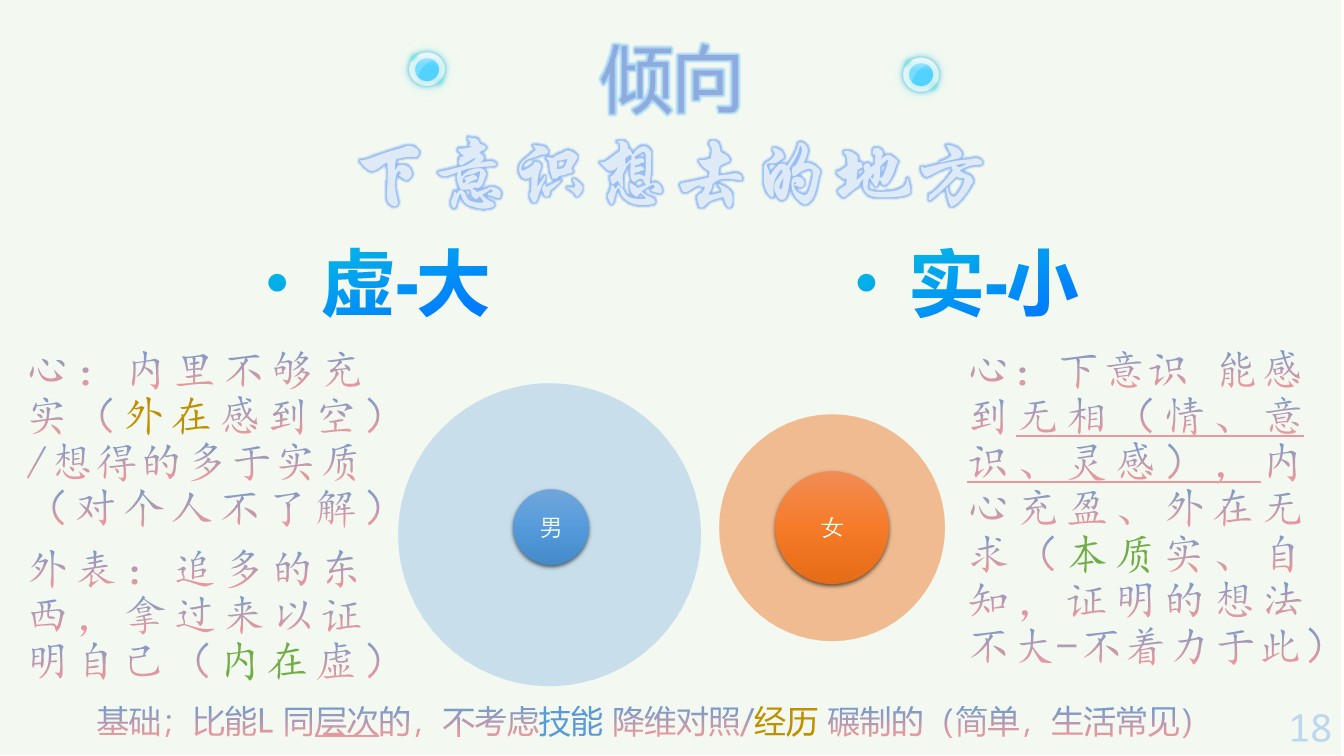 力度小:平时数值低、弱,微小的内容也可感知(喜欢轻、浅、淡,浓重的认为吵、乱);做到事、说的话,为铺设一幅大图景的各方向基础(男则一部分无法感知到,会觉得无用)