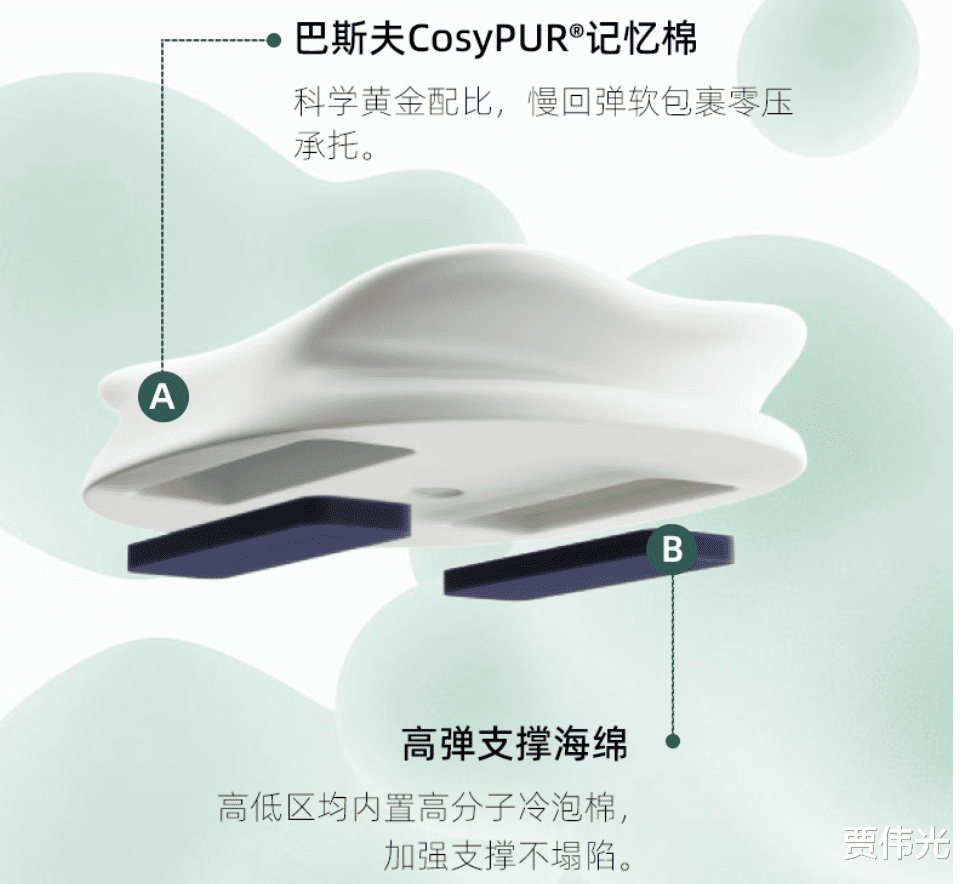 除了主要的巴斯夫CosyPUR记忆棉材料,在枕头的下方还有两块长方体的高弹支撑海棉,两者搭配可以达到软硬结合,满足多种睡姿下柔软与支撑的双向平衡。