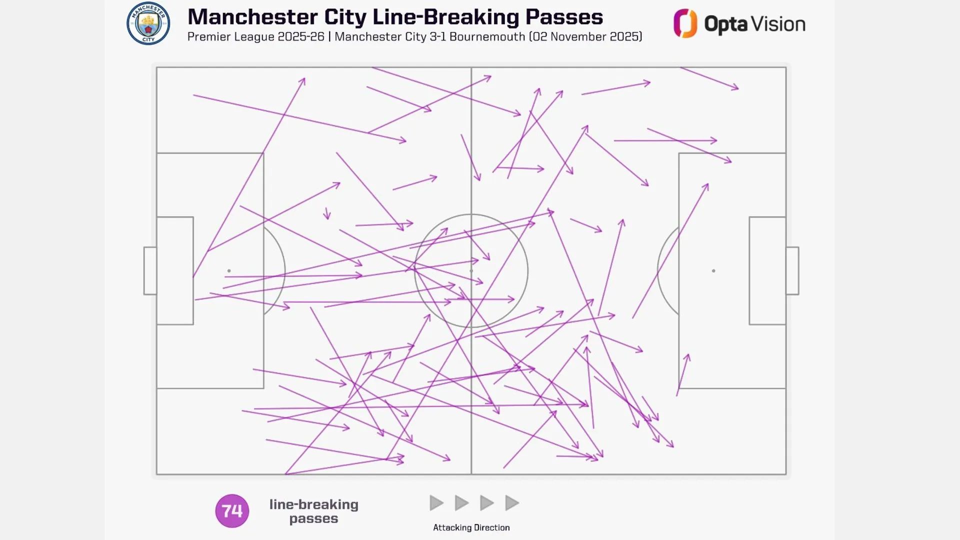 一次来自后场的聪明头球一次来自福登做球后的精妙挑传这类“提前直塞”在比赛前段就已出现端倪。