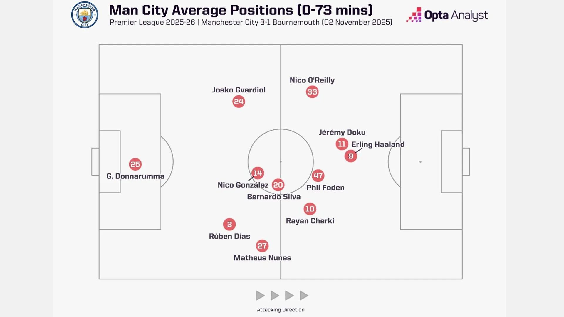 六、自由移动的切尔基,让伯恩茅斯无从限制切尔基在10号位与右路之间自由穿插,他在73分钟内完成69次触球——全队仅次于踢满全场的球员。瓜迪奥拉强调肋部球员的天赋是比赛的关键,而切尔基在这一点表现突出: