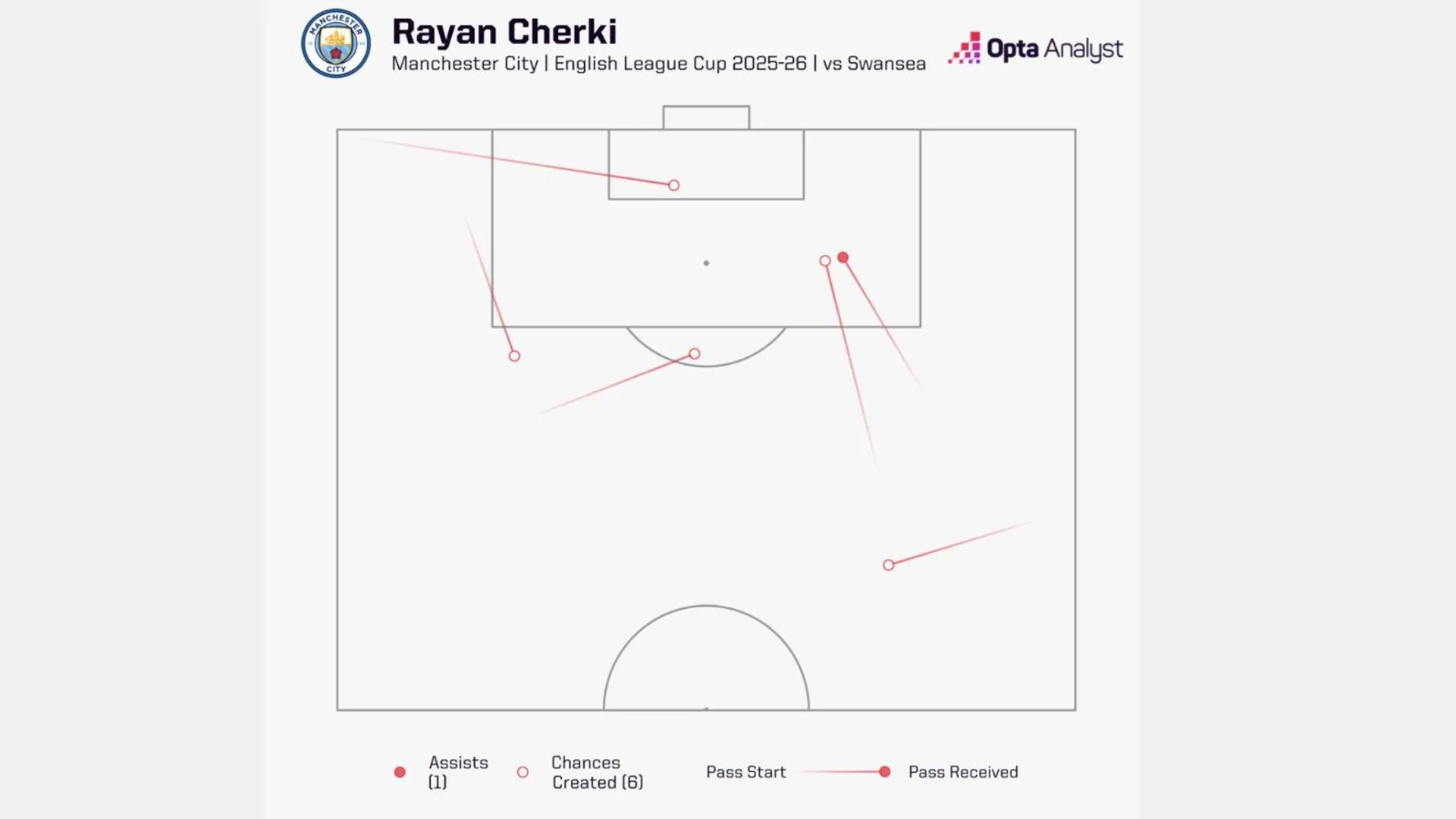 切尔基全场5脚射门,为队友创造6次机会。曼城上次有球员在单场比赛中参与超过10次射门行为,还要追溯到2024年5月,当时是福登对阵西汉姆的比赛。
