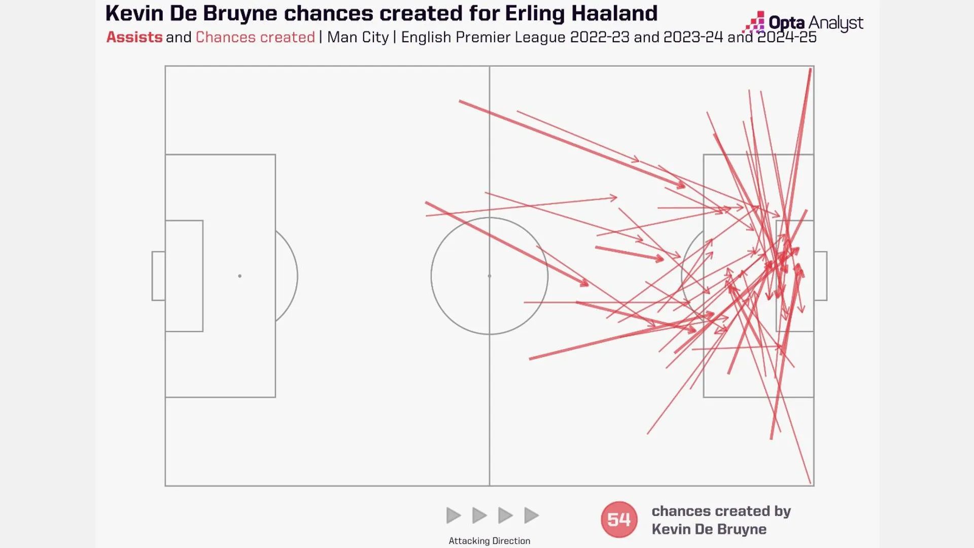 德布劳内在英超为哈兰德创造了55次机会,是同期联手次数第二多的组合。而如果不是伤病,他们可能会排名第一。