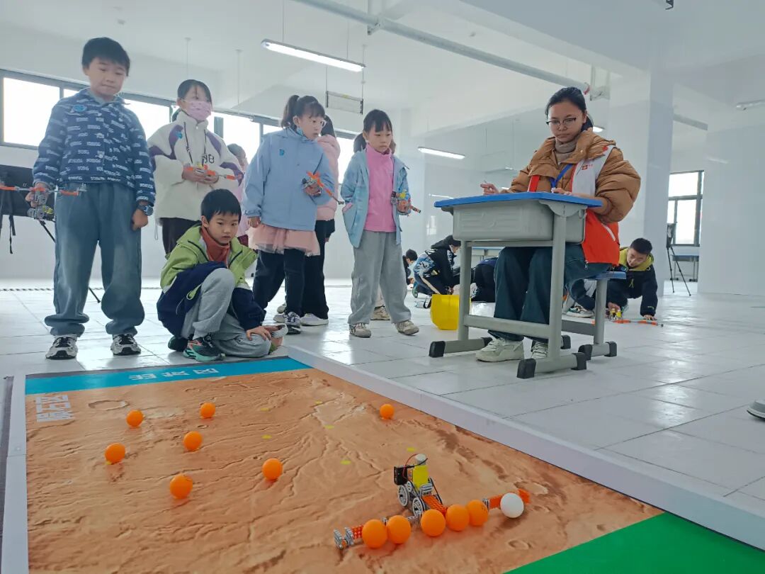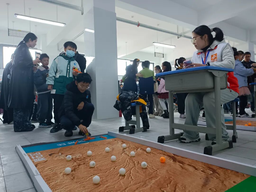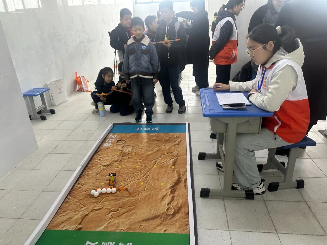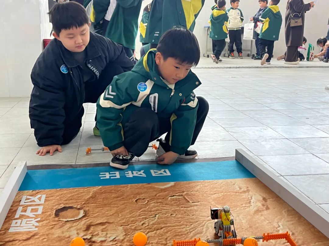 “火星任务”收集车设计挑战赛本赛项要求选手通过自己设计创作的“火星任务”收集车进行模拟陨石的收集竞赛,重点在于“展臂”的巧妙设计,如何才能收集更多的“陨石”,以此考察学生的工程设计能力和实践操作能力。赛场上,一个个小选手设计出不同的“展臂”,尝试采用不同的策略来个大比拼,看看谁收集的“陨石”更多。今年新增了一个高分值的“陨石”,进一步增加了比赛的挑战性和趣味性。