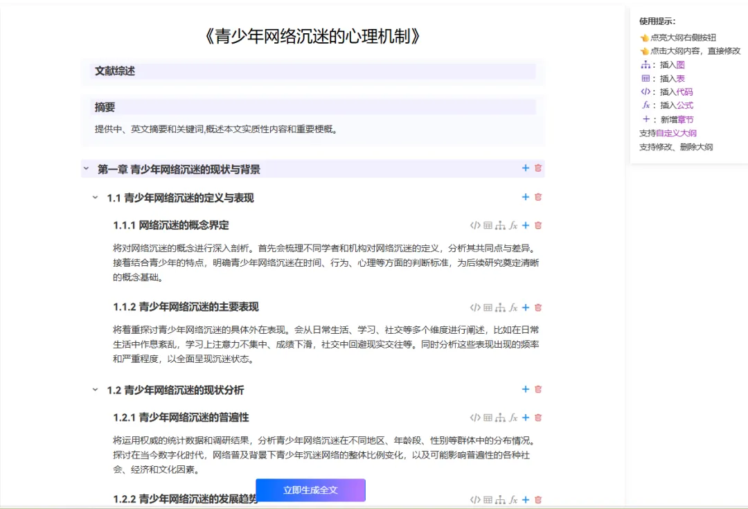 确认所有参数后,系统可一键生成结构清晰的论文三级大纲。该大纲支持在线无限次修改,您可通过拖拽等方式灵活调整章节逻辑。此外,系统还支持预先在框架中标记或“点亮”需要插入的图表、公式等可视化元素的位置,充分发挥AI论文辅助工具的效能。