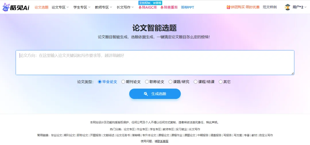 一、酷兔AI论文 专业级AI论文写作工具酷兔AI官网:https://www.kutulunwen.com/酷兔AI论文是一款基于DeepSeek-R1大型语言模型与AI5.0技术架构的专属学术论文写作辅助平台。其核心能力建立在千万级跨学科学术数据库的训练基础上,通过语义重构技术保持专业术语准确性的同时优化表述结构,全面覆盖从毕业论文、期刊论文、课题论文,到教材、专著的多元学术创作场景。