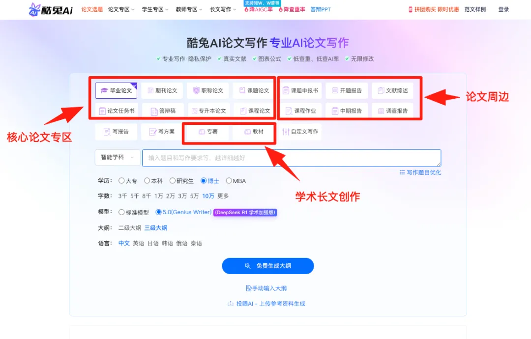 酷兔AI论文工具深度融合DeepSeek-R1学术大模型与AI5.0技术,凭借其免费智能选题、三级大纲生成、10分钟生成万字论文、长文连贯写作(支持最高60万字内容生成)、查重率和AIGC率控制在10%以内以及答辩PPT一键生成等核心功能,全程辅助毕业论文、期刊论文、课程论文和课题论文的写作,同时,也是全网首个支持60万字学术专著和教材的AI学术论文辅助工具。