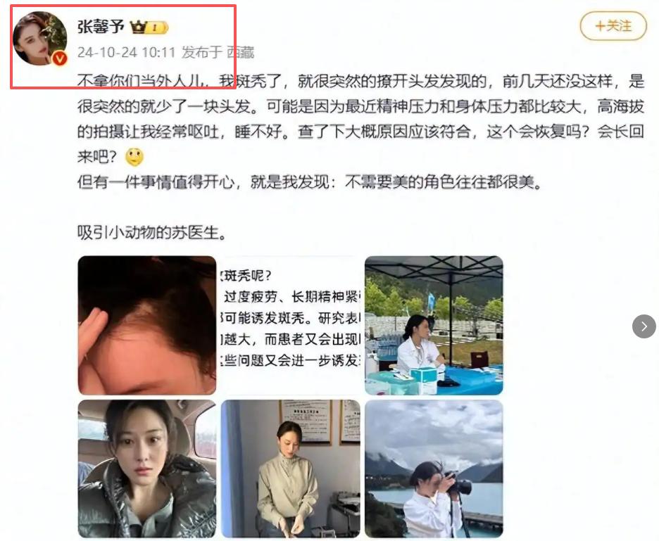 往前推几个月,她在拍摄援藏题材电视剧《比山更高的地方》时,因为高原反应严重导致头发大把大把地掉,最后居然出现了斑秃。