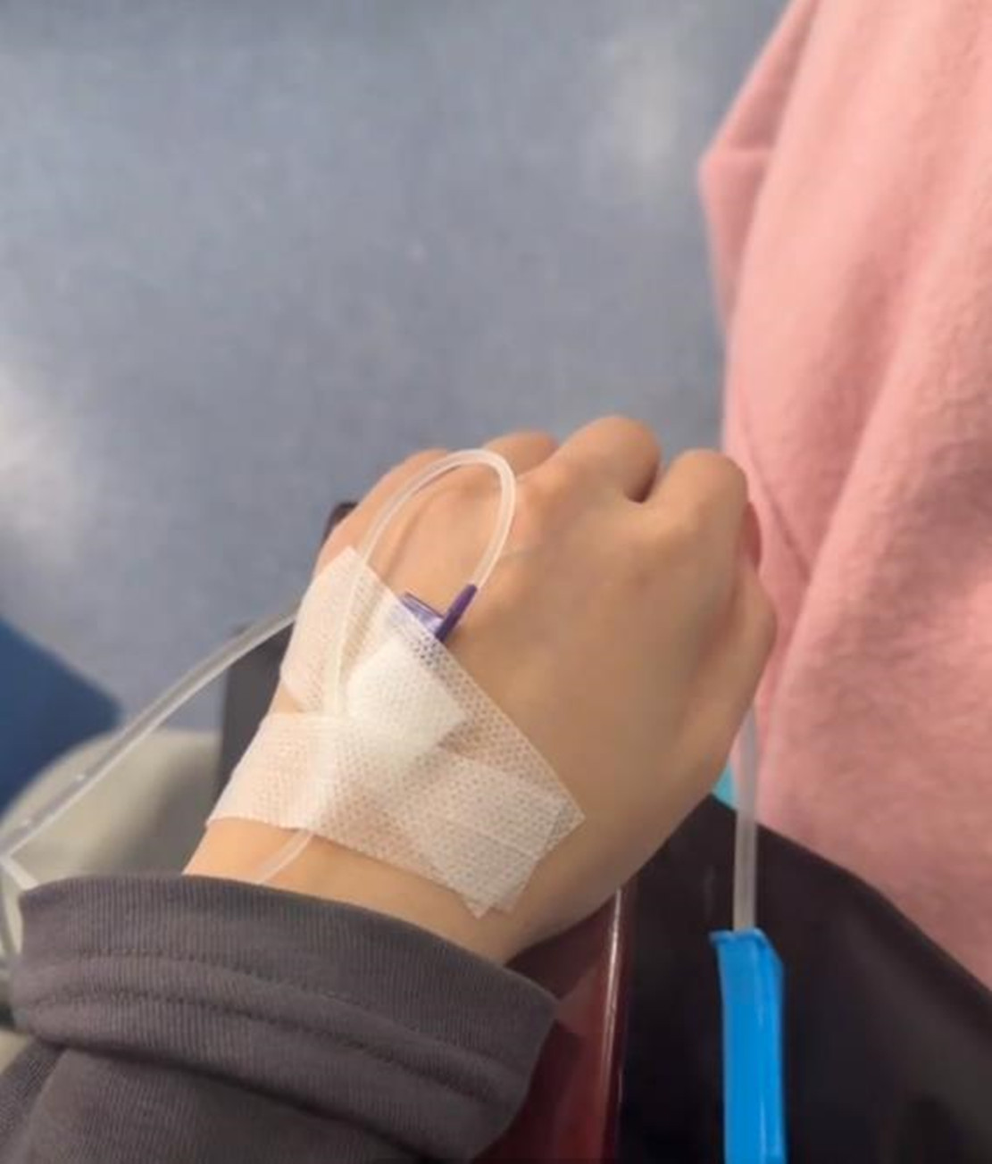 照片里的张馨予面色憔悴,手背上扎着针头,眼神里透着疲惫。