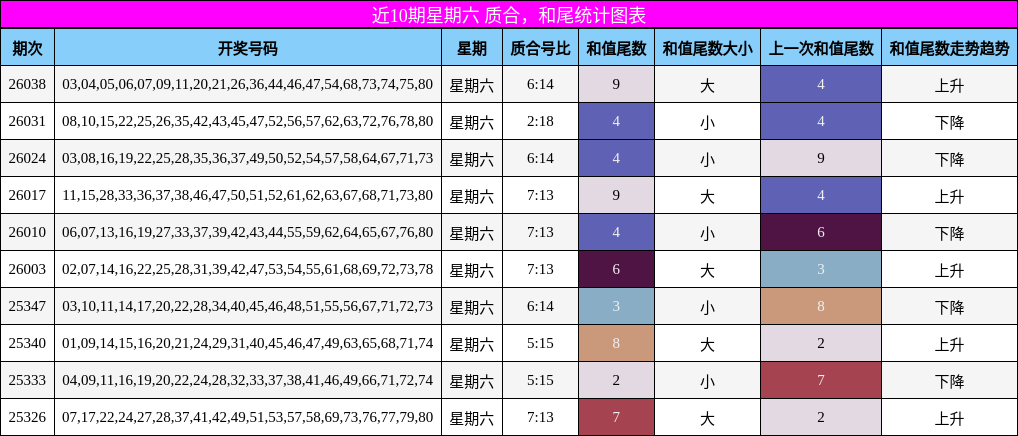 下图展示了近10期星期六质合与和尾的走势变化。可见合数连续多期高位运行,质数则在低位徘徊,形成明显反差。和尾走势波动较小,集中在2-9之间,本期关注尾数在3-9区间,尤其以6为中心的下降趋势,与上期尾数为偶数形成反向预期,预示和值尾数可能回落。