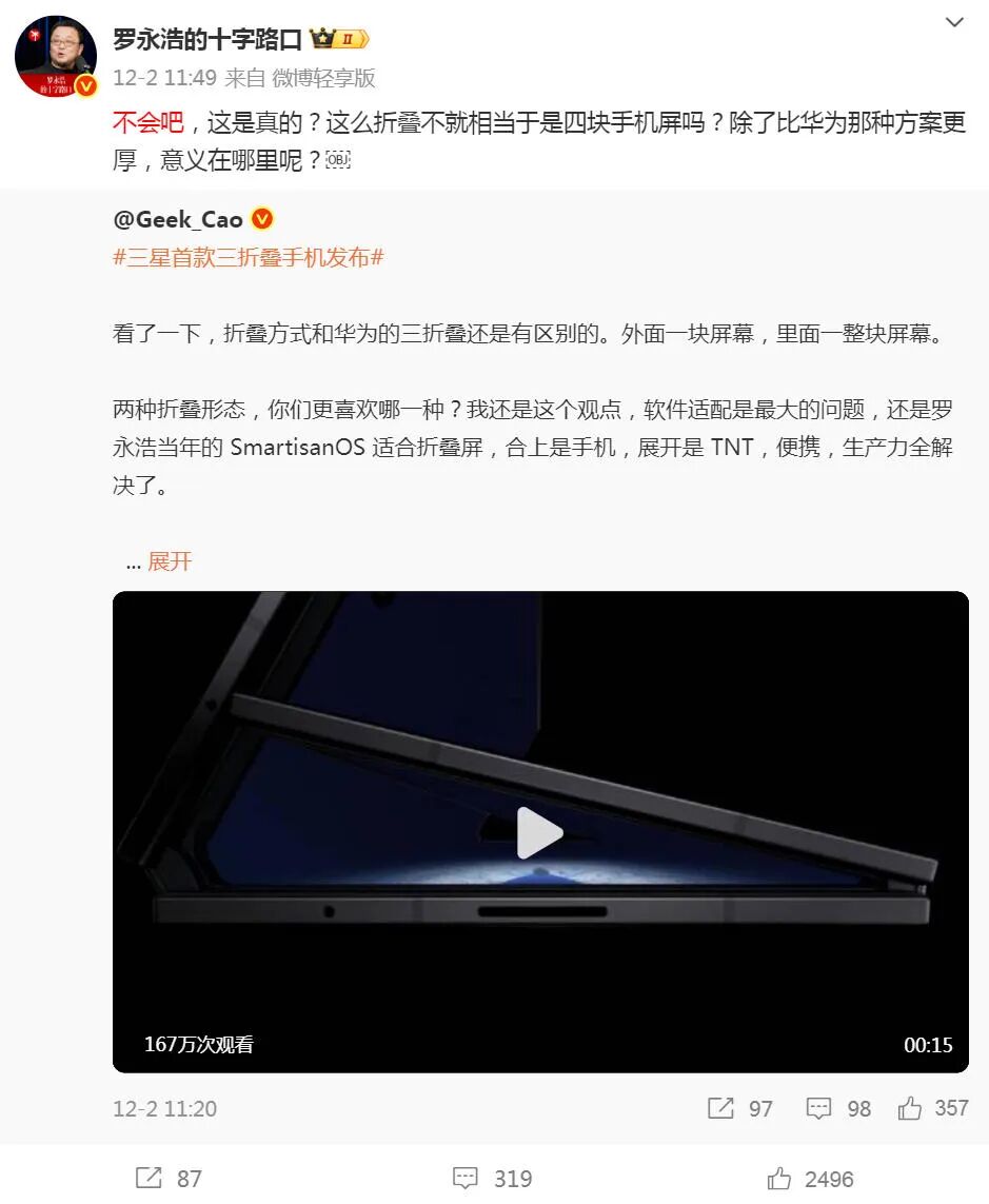 就连罗永浩都没忍住吐槽了一嘴,这么折叠不就相当于是四块手机屏吗?除了比华为那种方案更厚,意义在哪里?