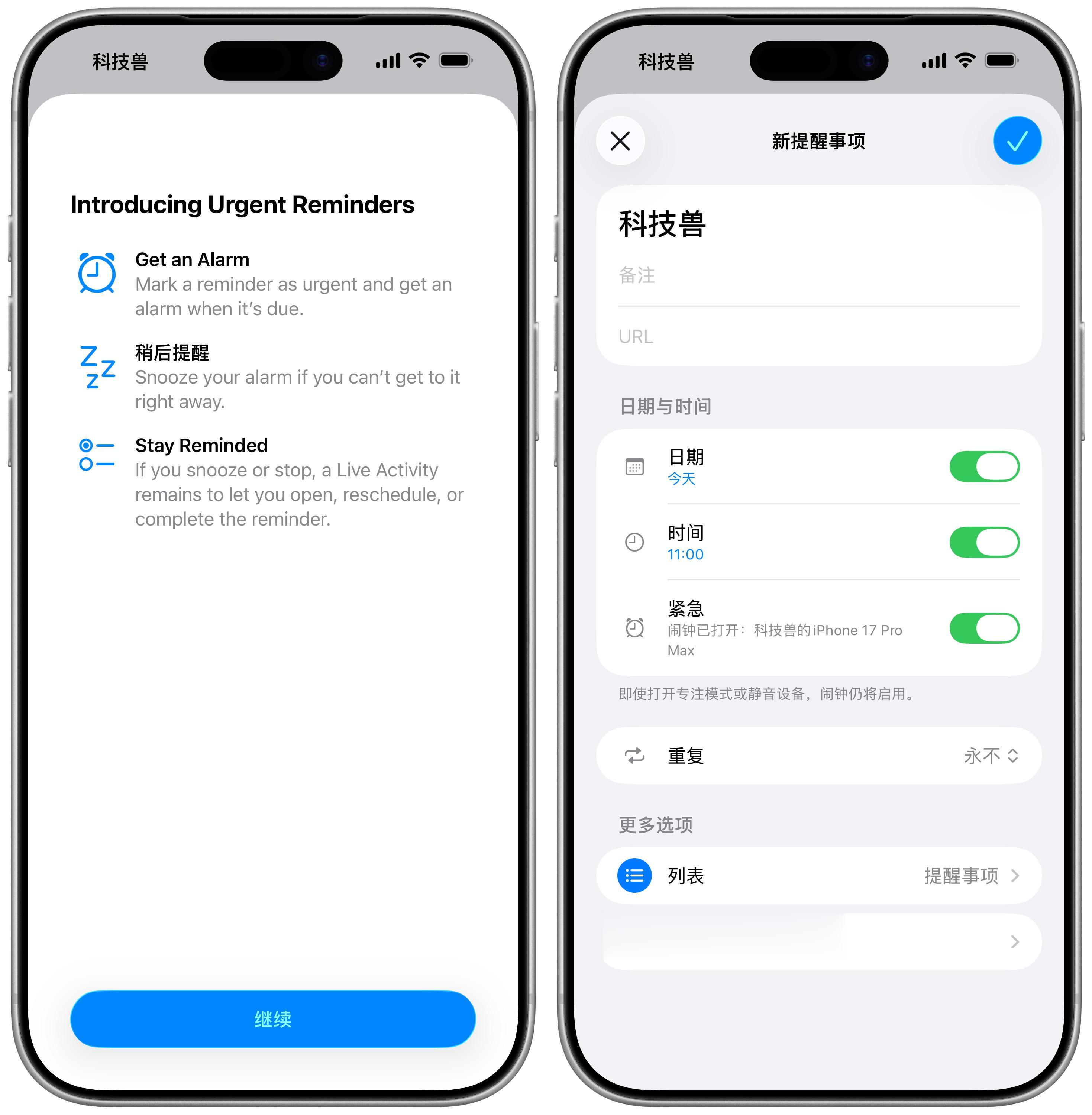 提醒事项功能升级 提醒事项 App 在此次更新中也得到了小幅升级,首次进入提醒事项时,会弹出提示卡片显示新增功能。同时我们在创建提醒事项时可以将其标记为“紧急”。届时,iPhone 会在指定时间通过闹钟的形式发出提醒。