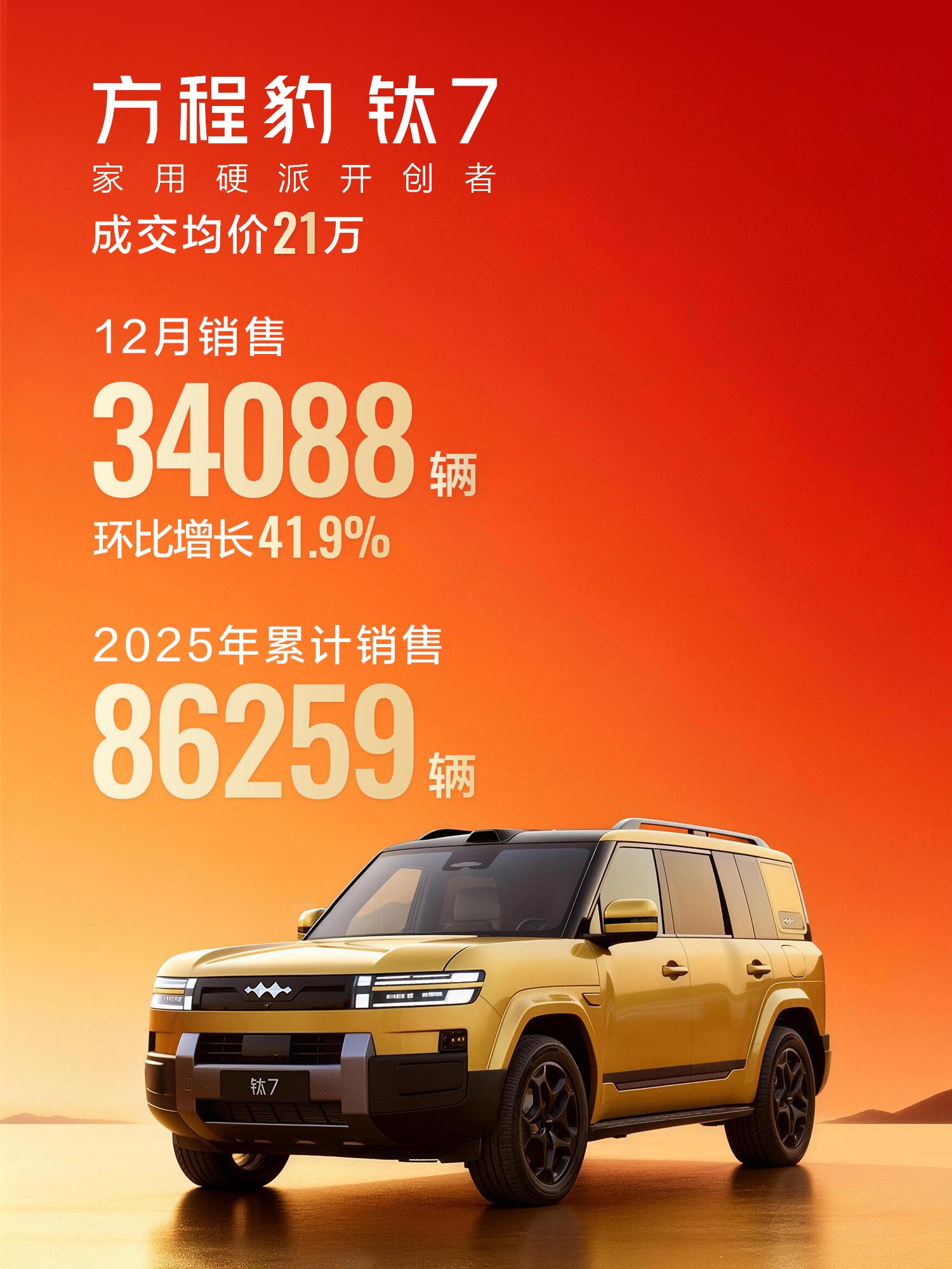 12月,作为现象级爆款车型,“家用硬派开创者”钛7销量34088台,环比增长41.9%,有望蝉联混动SUV、方盒子双冠军,并有可能夺得中大型SUV冠军,或将提前锁定“三冠王”成为全品类冠军。上市不到4个月,钛7累计销量突破8.6万台,成交均价21万,是2025年“叫好又叫座”的顶流车型。