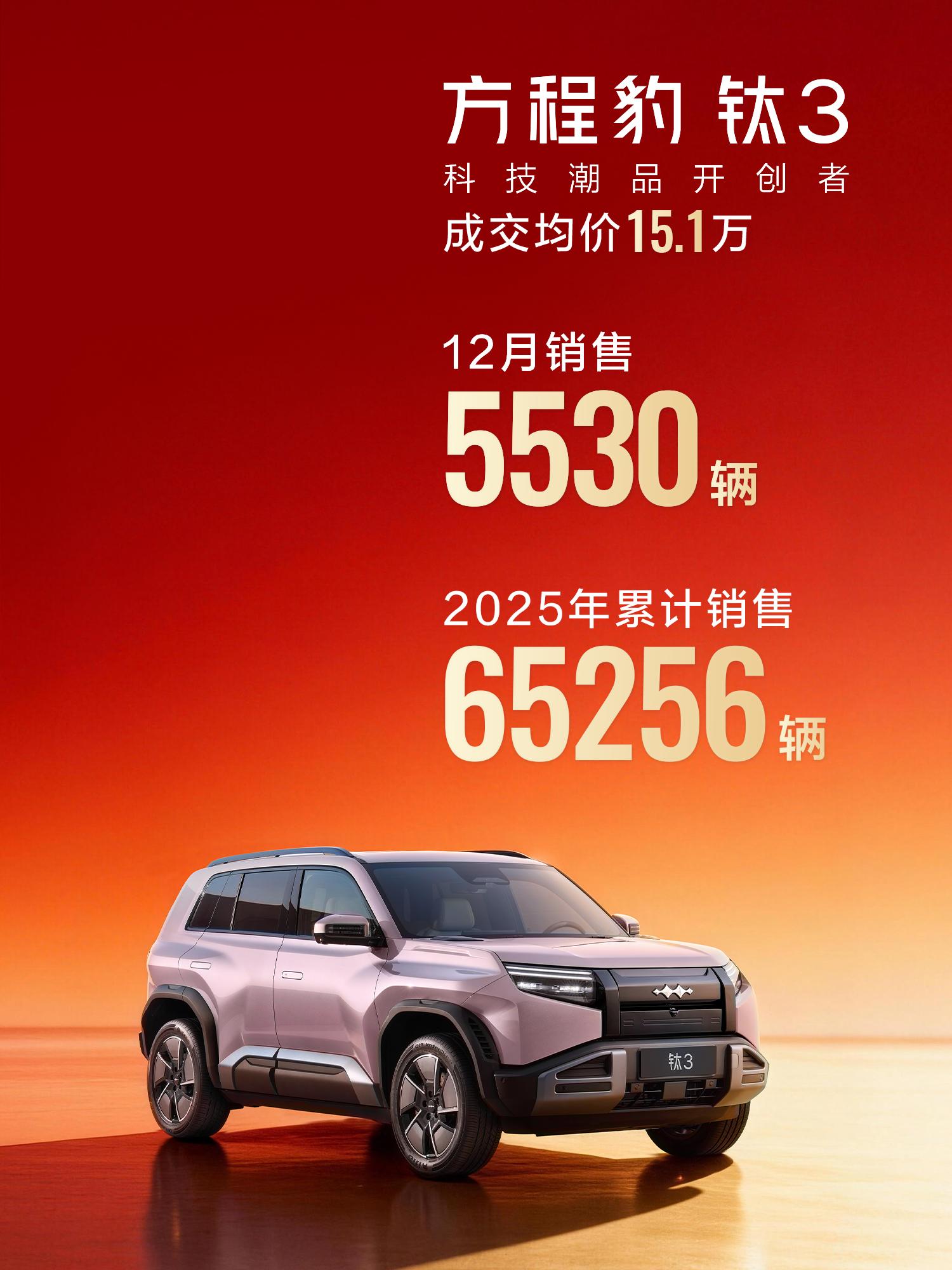 “科技潮品开创者”钛3销量5530台,累计销量突破6.5万台,成交均价15.1万,依旧是纯电方盒子爆款车型,深受年轻用户喜爱。“电驱越野开创者”豹5销量8777台,,环比增长57.6%,全年累计销量近6万台,成交均价26.3万,是当之无愧的“越野新王”。“智能硬派开创者”豹8销量2473台,,环比增长40.3%,全年累计销量23286台,成交均价39.6万,持续领跑40万级高端新能源SUV市场。