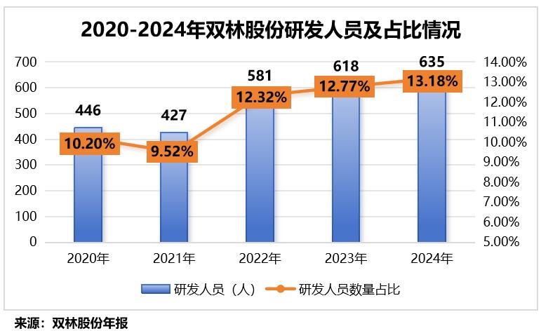与此同时,公司的研发人员从2021年的427人增加至2024年的635人,研发人员数量占比也从2021年的9.52%提升至2024年的13.18%。