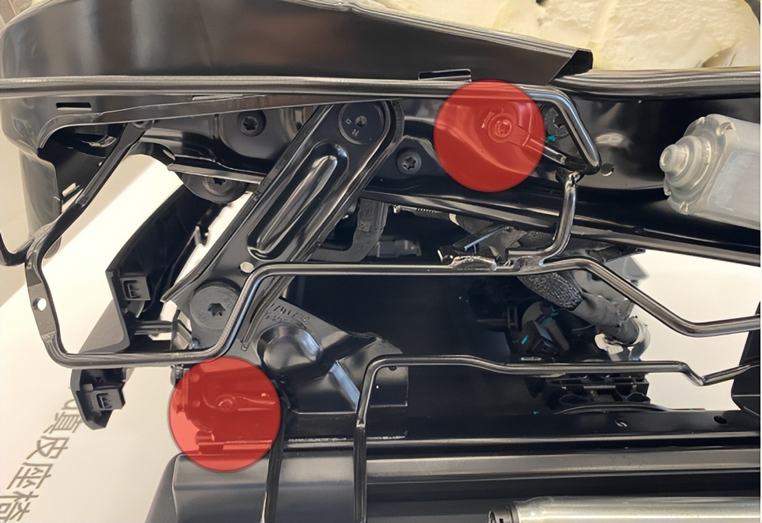 又比如这座椅旁侧的钢丝,笔者过往经历的项目都是使用的焊接,但是理想除了三排座椅外都是使用的螺钉连接。焊接的缺点是在没有足够数量的检具和夹具保证下,钢丝的位置精确度非常差,很难保证批次间的一致性,一装配成座椅总成后,就带动旁侧板偏转,与面套的干涉量增加,座椅在调节运动时产生摩擦的噪音。螺钉装配会单独增加一个装配工序,只要冲压的螺丝孔位置度正确,螺钉的扭矩达到标准,至少能保证同批次的一致性。