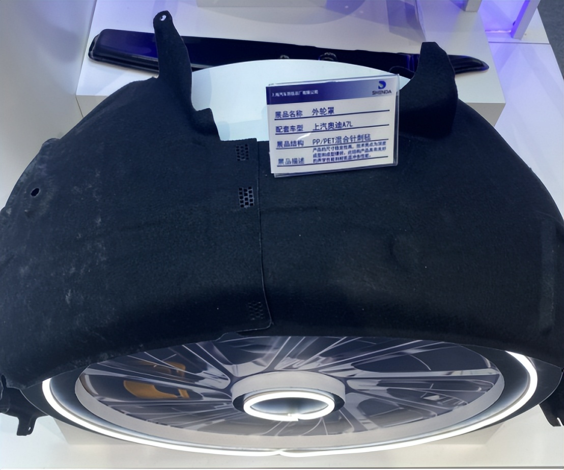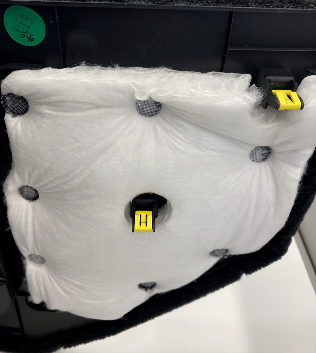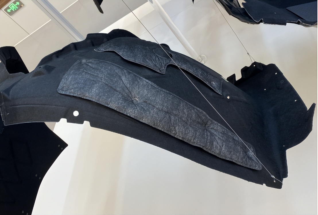 再比如这四轮轮罩,早先我在参加另外一家供应商的展览时发现,诸如60万级别的友商在拆开来发现他也只用了一层PET混合针刺毡,但Mega除了使用了织物的PET材质外,还各增加了两条吸音棉,能更好的吸收轮胎的噪音。