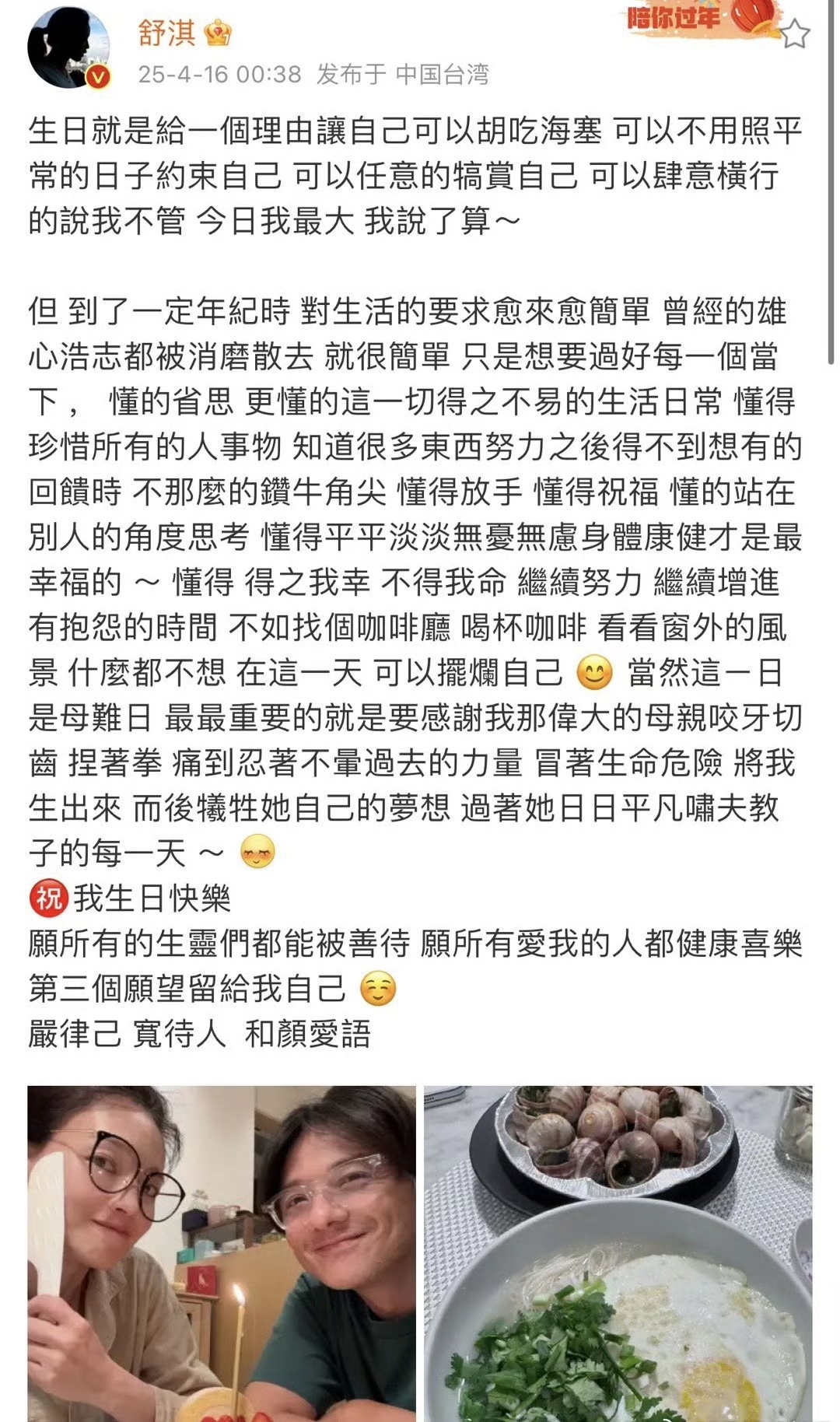 舒淇于4月16日(49岁生日)在社交媒体发布长文,引发广泛关注。