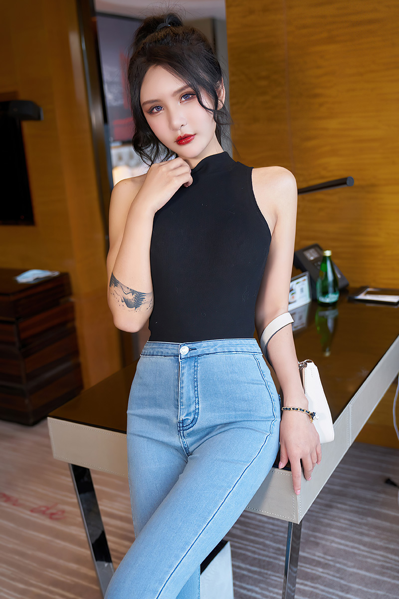 在时尚的万花筒里,简约穿搭往往藏着最打动人的魔力。这次的黑色挂脖无袖上衣与浅蓝紧身牛仔裤组合,便是一场关于线条与风格的精