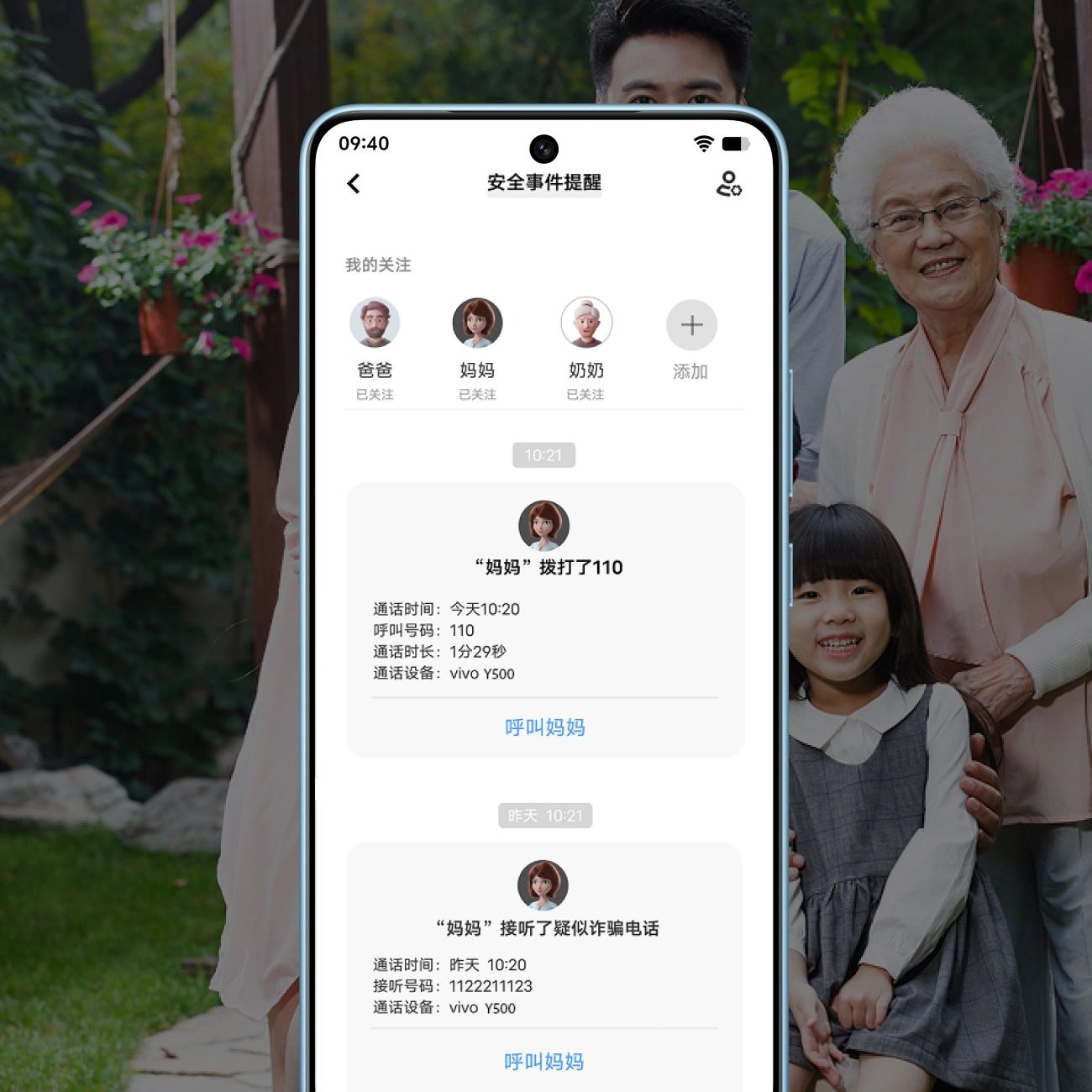 用机安全也是子女对长辈用机的一大顾虑。对此,vivo Y500的“长辈安心三件套”,还支持安全卫士功能,既能自动阻止恶意应用自动安装,避免长辈误装流氓软件;还可屏蔽“摇一摇”广告跳转,防止长辈误点广告造成财产损失。此外,这项功能还支持风险提醒,当长辈接通诈骗电话、安装恶意应用或呼叫110等紧急号码时,系统会及时通知其他家庭成员,让子女无需时刻为长辈的财产和人身安全操心。
