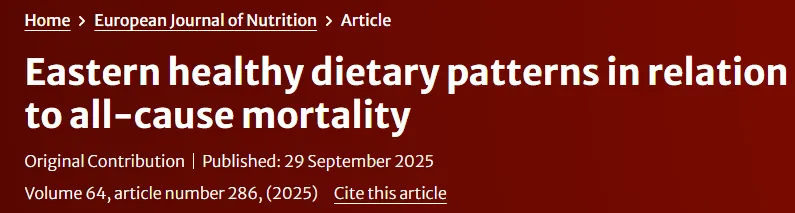 [1]Wang X, Xuan J, Chen H,et al. Eastern healthy dietary patterns in relation to all-cause mortality[J]. Eur J Nutr. 2025 Sep 29;64(7):286. DOI: 10.1007/s00394-025-03807-6.