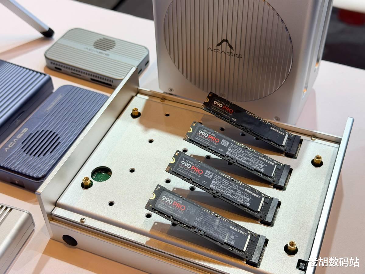 如果你对速度有极致要求,那阿卡西斯展出的4盘位全闪雷电5硬盘柜才是焦点。它不仅支持全闪NVMe RAID阵列(也就是把多块高速固态硬盘组合起来提速),更重要的是,它额外留出了两个雷电5接口,可以再接两个硬盘盒。这样一来,最多能让6块硬盘同时跑满雷电5的速度。这个性能直接对应的是8K视频剪辑、3D渲染缓存、AI训练这些“吃速度”的重活。