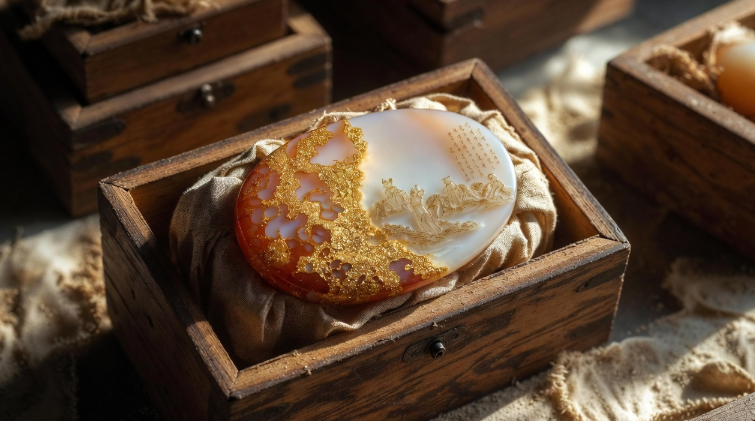 和田玉籽料自古以来就是“玉中之王”。出自昆仑山下的玉龙喀什河床,经过千年的冲刷,自然形成,皮色多样,有洒金、聚皮、枣红、秋梨等。清代特别是乾隆年间,皇帝对籽料十分喜爱,下令大量进贡,宫廷玉作局的匠人们用籽料雕琢摆件、佩饰、扳指,仿照明代陆子冈的刀法,做到“一器一诗”,浅浮雕山水人物,诗情画意。子冈款大多为清仿作,但是代表了当时最高的工艺水平,一块好的籽料牌,不但是佩饰,更像随身携带的一幅小卷轴,映出文人雅士的闲适、皇家的奢侈。