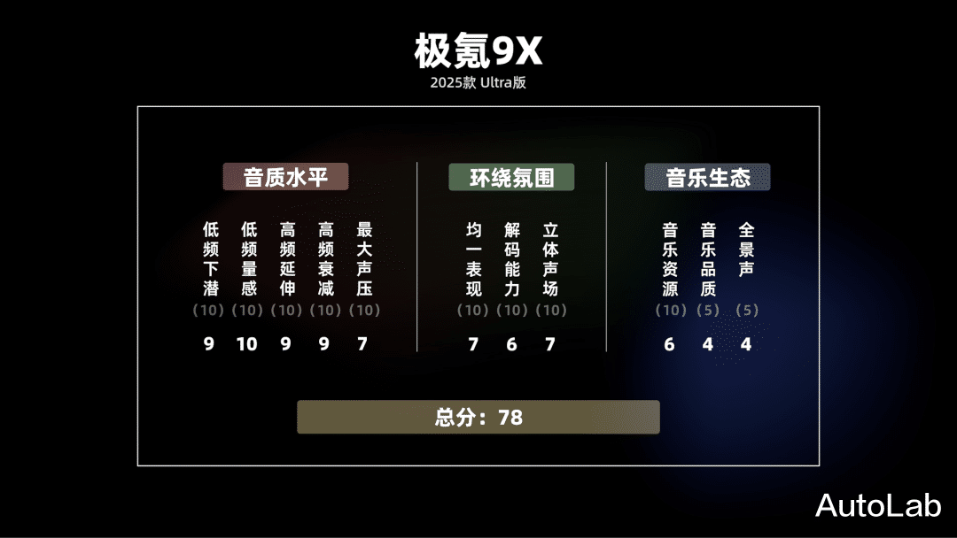 在最后,如果要为这一份由Naim、极氪、瑞声科技3方共创的成果打一个分,在实测后,AudioLab给出的成绩是78分。