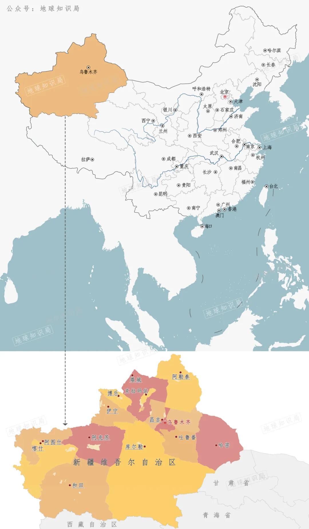 作为中国第一大省,新疆陆地面积占全国六分之一,但只有14个地级行政区划,110多个县级行政区划。