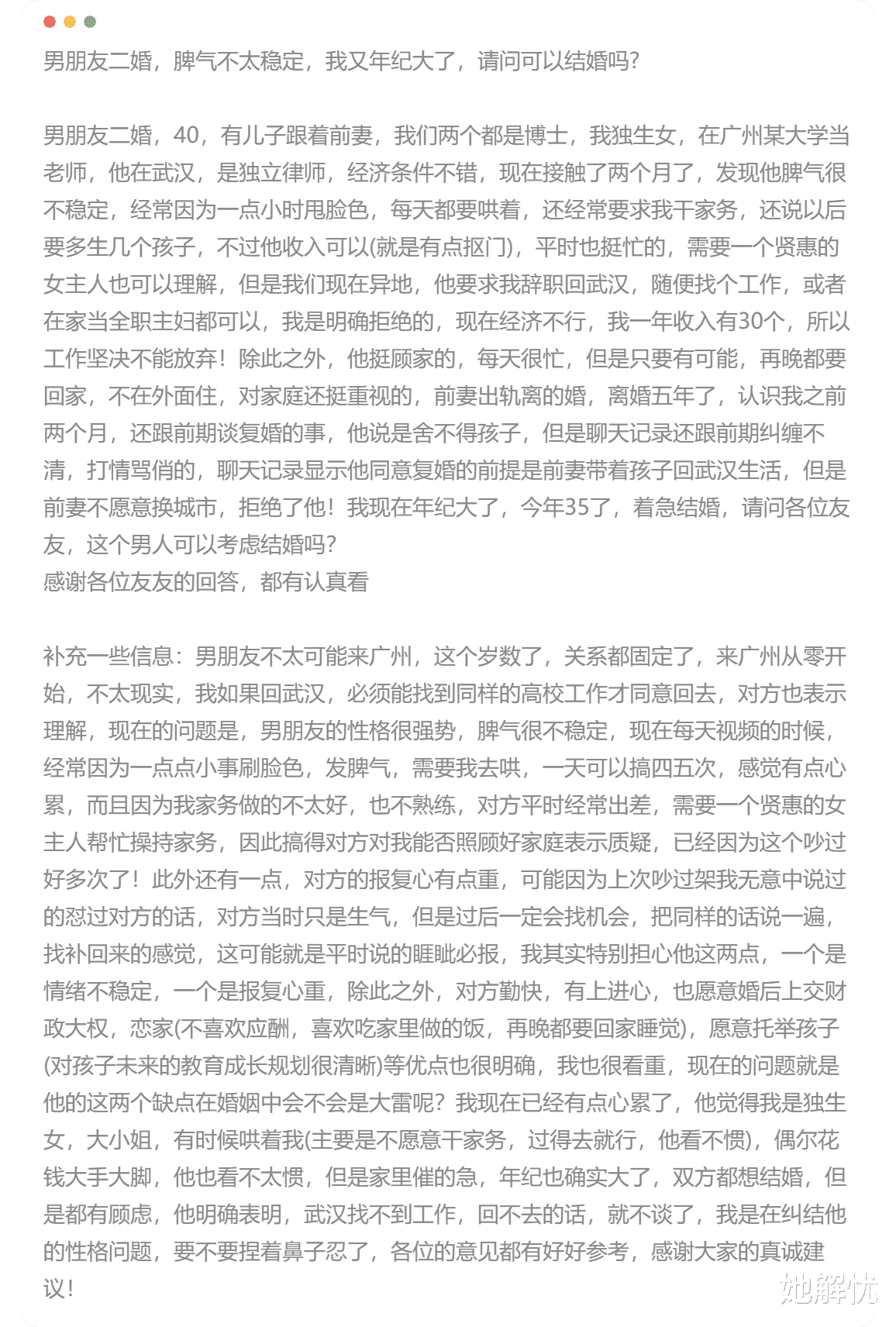 案例:35岁女博士与40岁二婚律师交往两月,面临婚姻抉择。男方经济优渥、顾家恋家、愿上交财政,但情绪极不稳定,日均因小事发脾气需哄四五次,且报复心重,会刻意“找补”争吵时的言语。他对“贤惠女主人”要求苛刻,因女方家务不熟练多次质疑其持家能力,还嫌弃她“大小姐作风”和消费习惯。双方异地(广州vs武汉),男方拒绝来穗发展,要求女方辞职回汉,女方30万年薪的高校工作不愿放弃,仅接受武汉同等级教职。男方优点显著:勤快上进、重视子女教育、无不良嗜好,但情绪失控与睚眦必报的性格缺陷已让女方深感疲惫。当前僵局在于:女方纠结性格缺陷是否为婚姻“大雷”,男方则以“不回武汉就分手”施压,双方在现实条件与情感需求间难以调和。