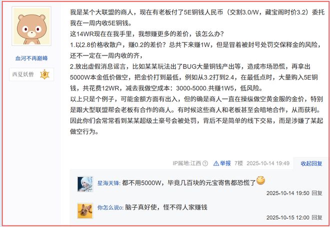 此次风波的导火索始于黄金服“凤凰区”的一场有预谋行动。资本方首先在玩家社群散布谣言,声称游戏存在严重程序漏洞(BUG),已非法生成数十亿铜钱并流入市场,断言“铜钱即将大幅贬值,货币体系面临崩盘”。