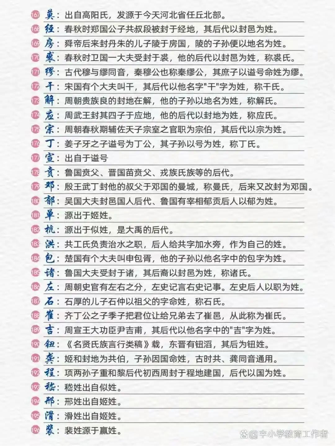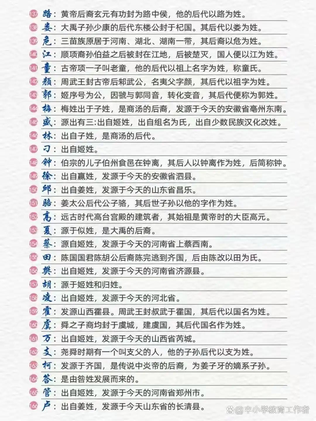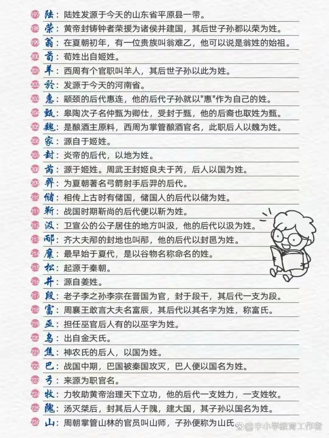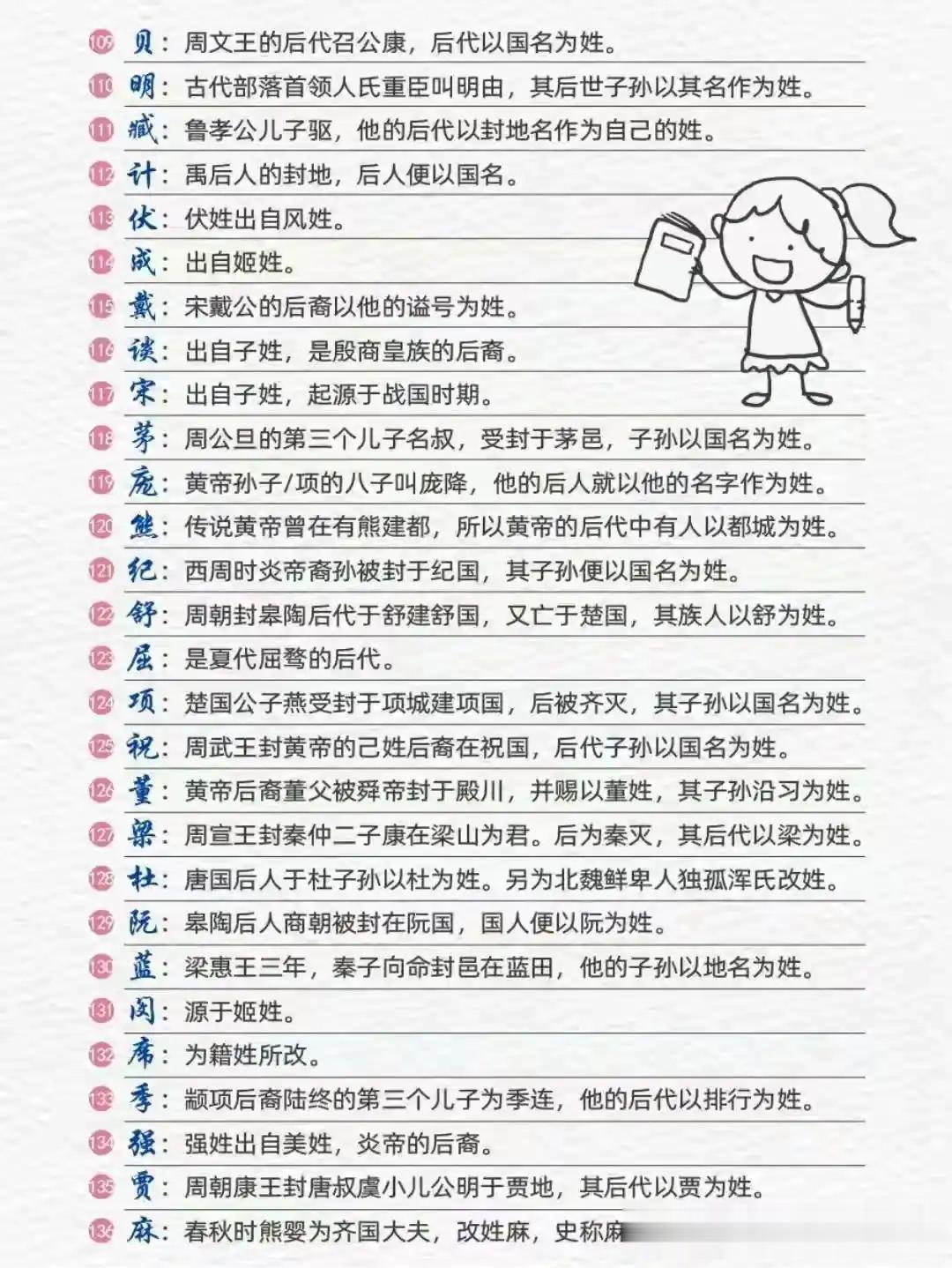 鲁Lǔ:周公旦的儿子伯禽受封于鲁地,后来鲁国的王公贵族都以鲁为姓。